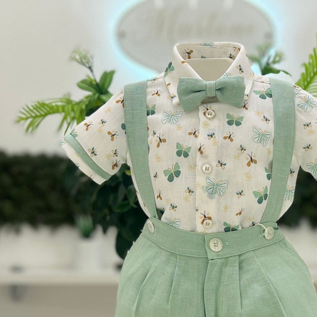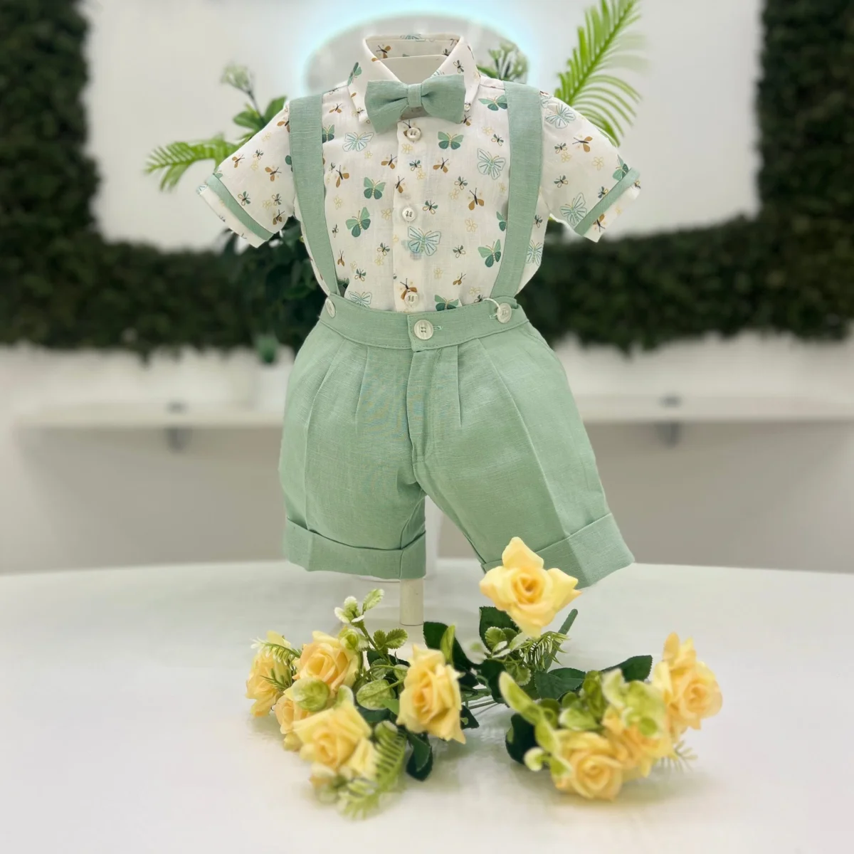 Completo cerimonia neonato nei toni del verde salvia, composto da bermuda a vita alta con risvolto e bretelle coordinate, chiusura con bottoni e piega frontale per una linea impeccabile. Camicia a manica corta con fantasia di farfalle e libellule, collo classico e bottoni frontali. Papillon abbinato per un finale perfettamente armonico: fresco, ricercato, pronto per le occasioni che contano.