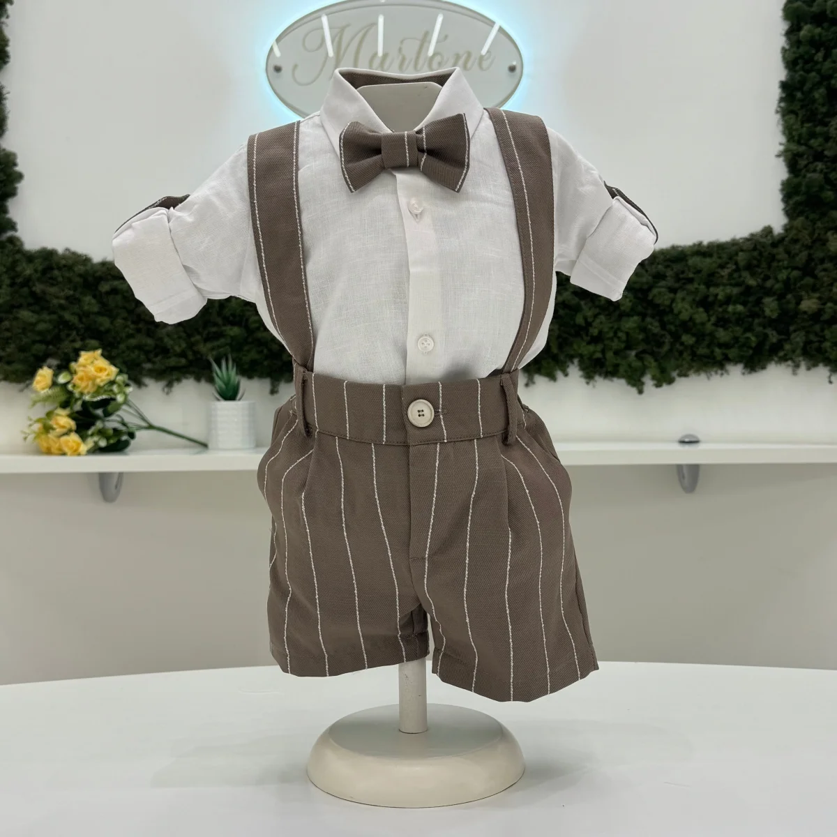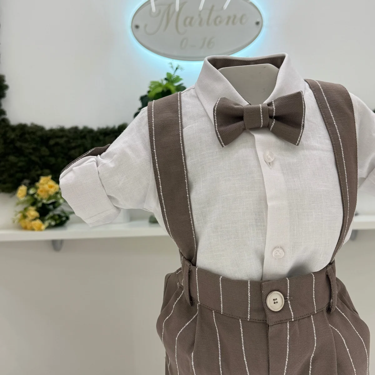 Completo cerimonia bimbo composto da camicia bianca con risvolto, bermuda rigato con bretelle coordinate e papillon abbinato. La combinazione di righe sottili e dettagli sartoriali crea un look raffinato e senza tempo. Perfetto per battesimi, cerimonie ed eventi speciali.