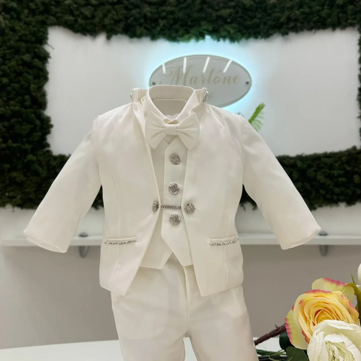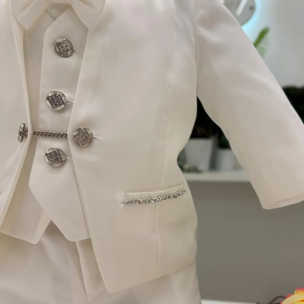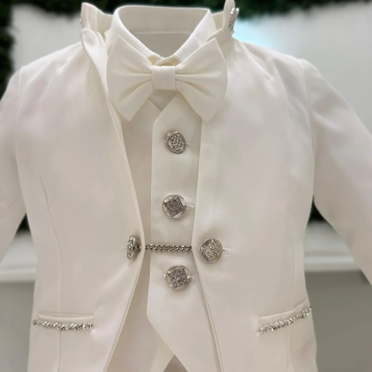 Completo da cerimonia dallo stile impeccabile, composto da giacca strutturata con collo coreano impreziosito da applicazioni luminose, gilet coordinato con bottoni gioiello e catena decorativa, pantalone dalla linea pulita e papillon abbinato. I dettagli brillanti donano carattere e raffinatezza, esaltando un design essenziale ma estremamente ricercato. Un’eleganza moderna, pensata per distinguersi nelle occasioni più esclusive.