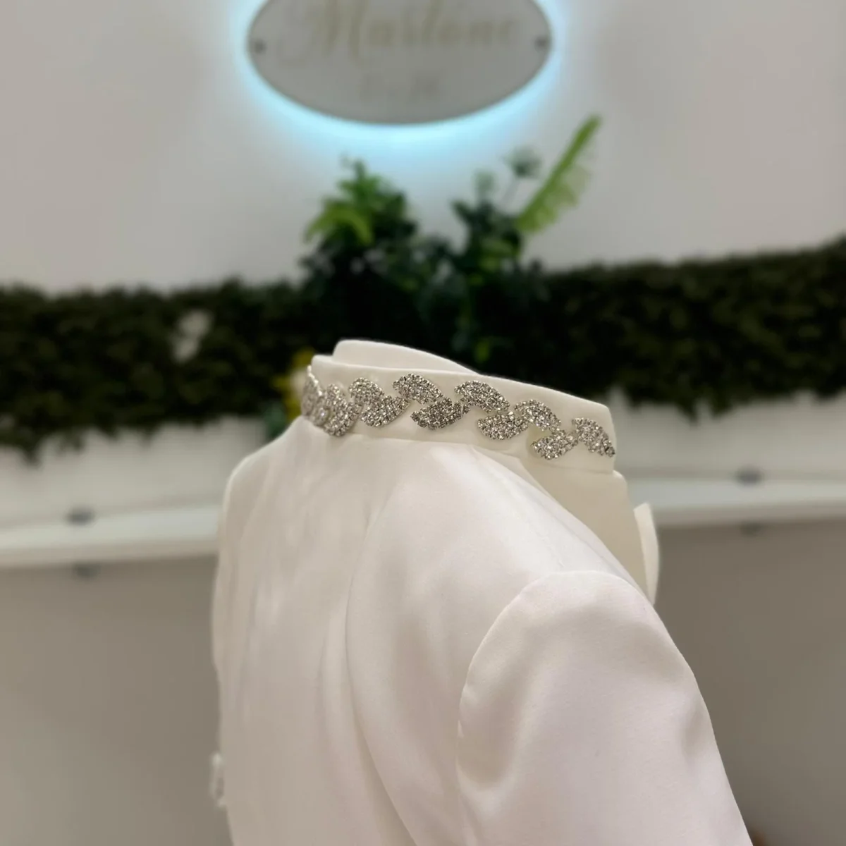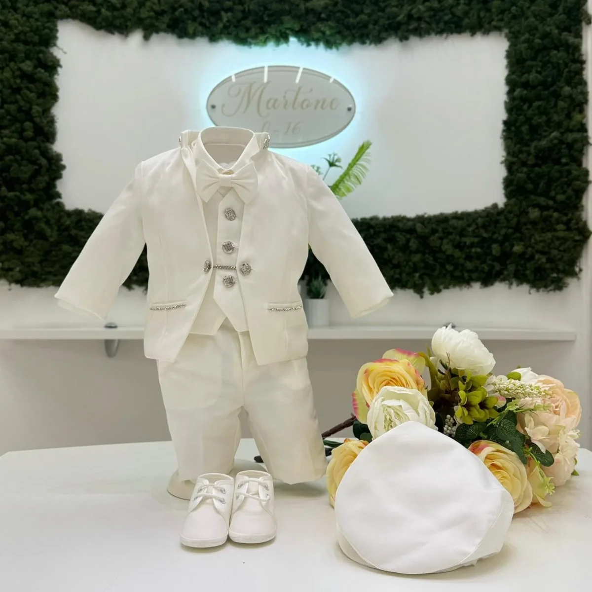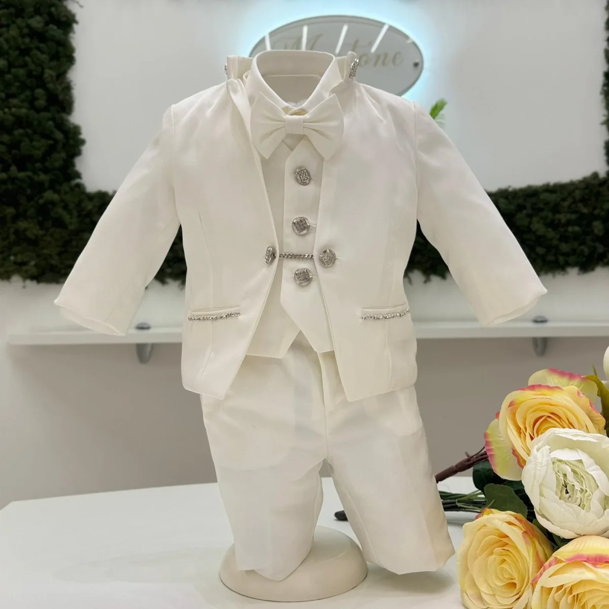 Completo da cerimonia dallo stile impeccabile, composto da giacca strutturata con collo coreano impreziosito da applicazioni luminose, gilet coordinato con bottoni gioiello e catena decorativa, pantalone dalla linea pulita e papillon abbinato. I dettagli brillanti donano carattere e raffinatezza, esaltando un design essenziale ma estremamente ricercato. Un’eleganza moderna, pensata per distinguersi nelle occasioni più esclusive.
