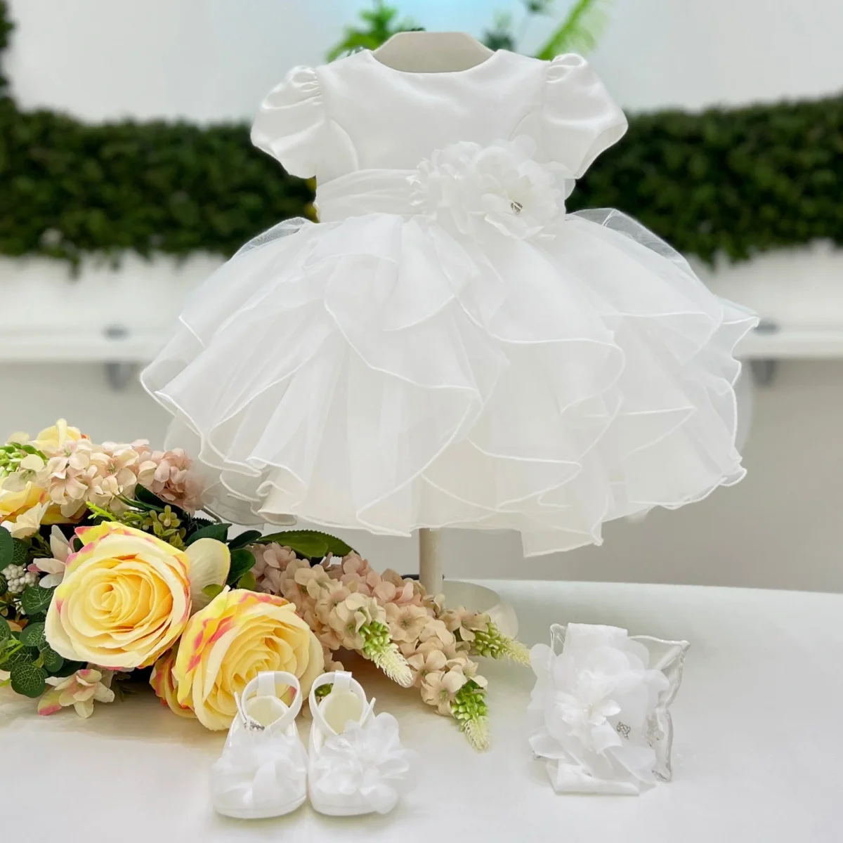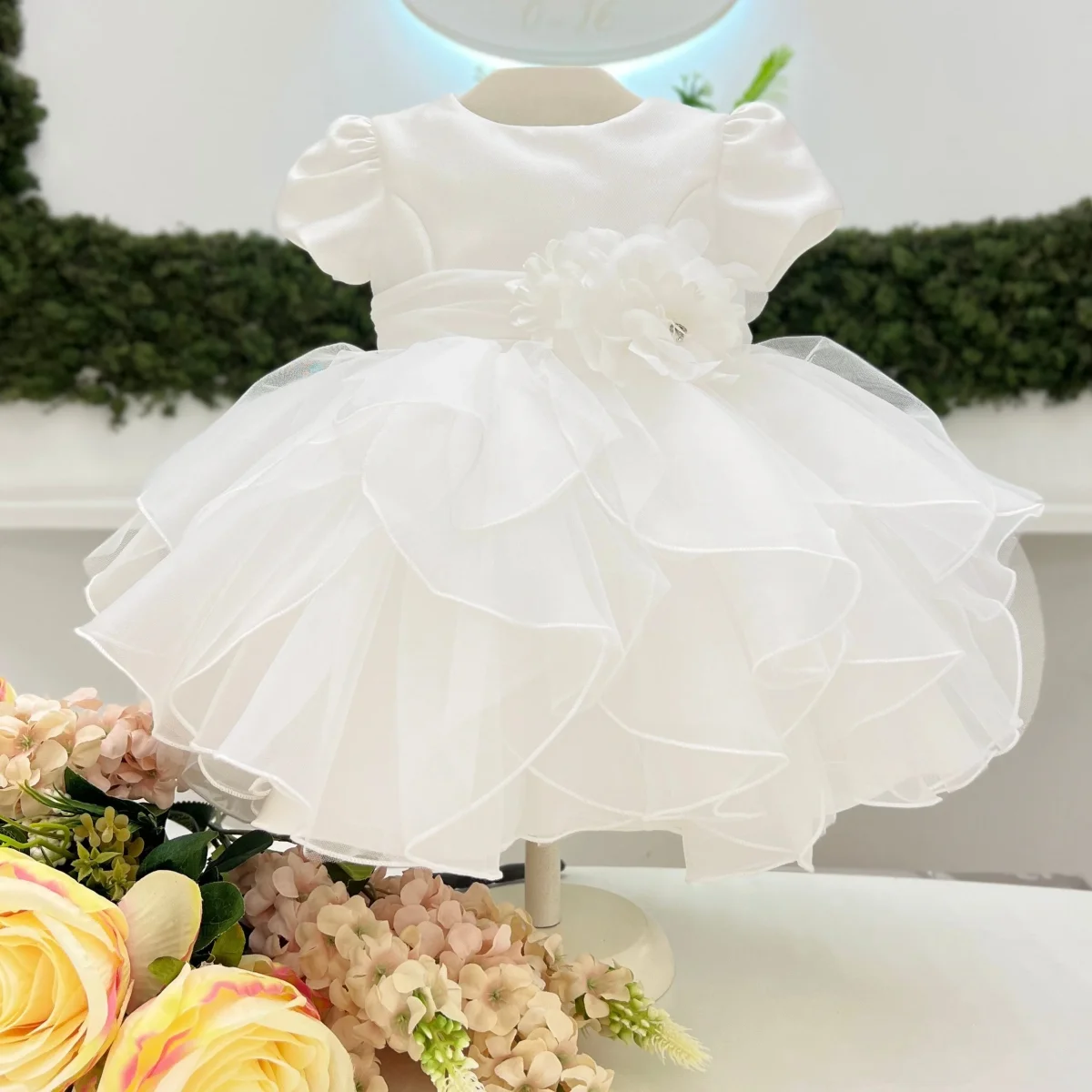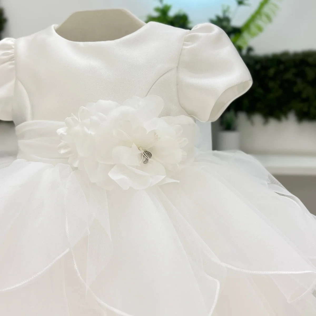 Abito battesimale in satin con corpino dalla linea pulita e maniche corte a sbuffo. Fascia in vita con applicazione floreale in organza tono su tono impreziosita da piccolo dettaglio gioiello. Gonna ampia in tulle multistrato con balze morbide e bordatura rifinita che dona volume e movimento.