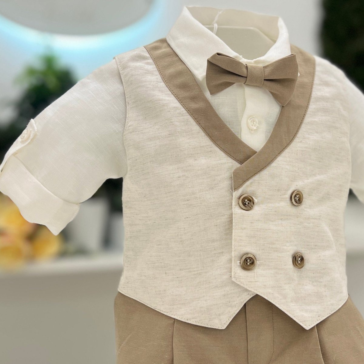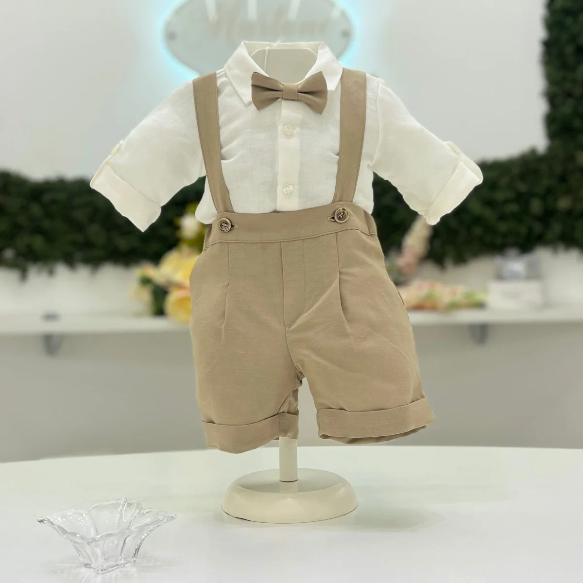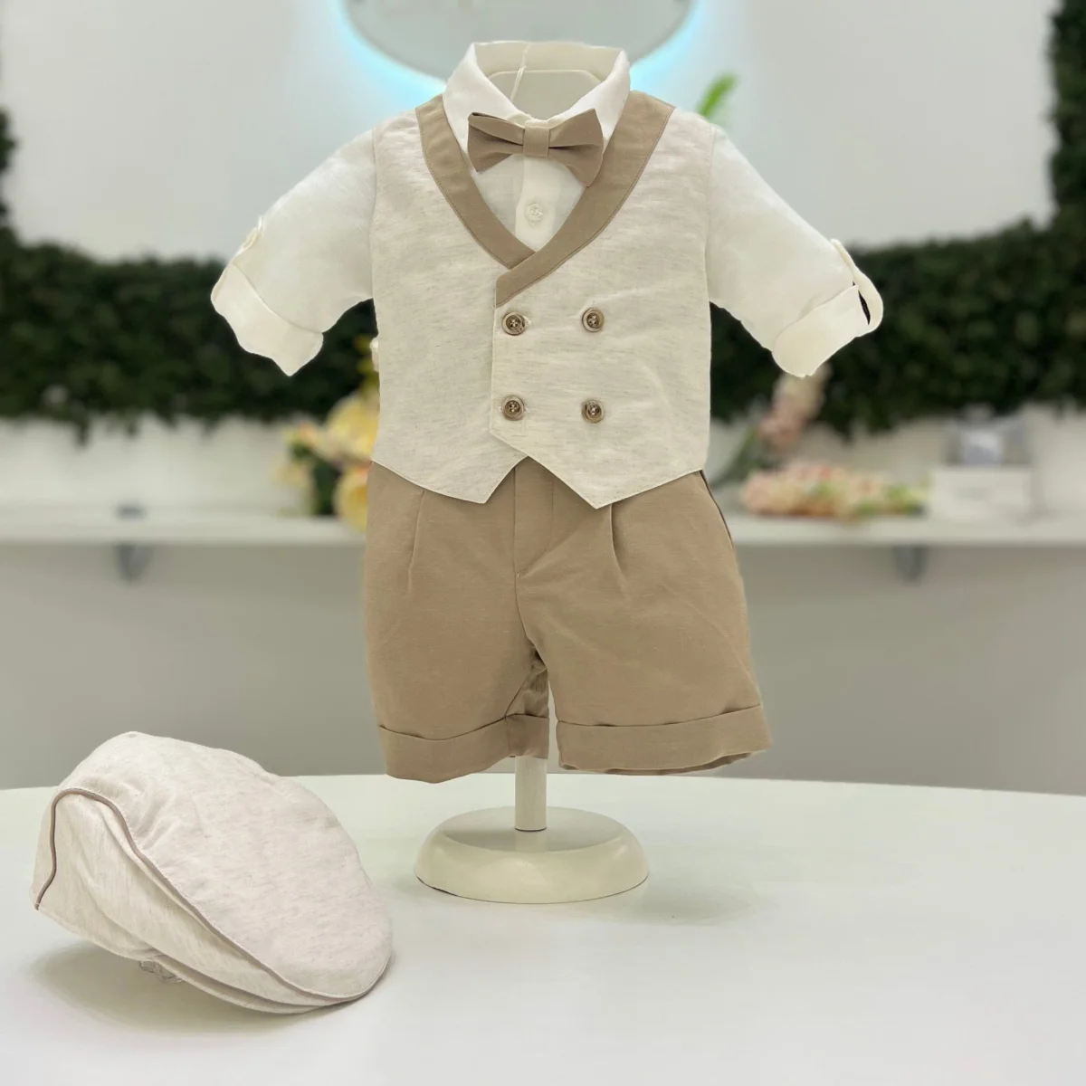 Bermuda color beige con risvolto al fondo e bretelle removibili, abbinato a gilet in lino con chiusura doppiopetto e profili a contrasto.