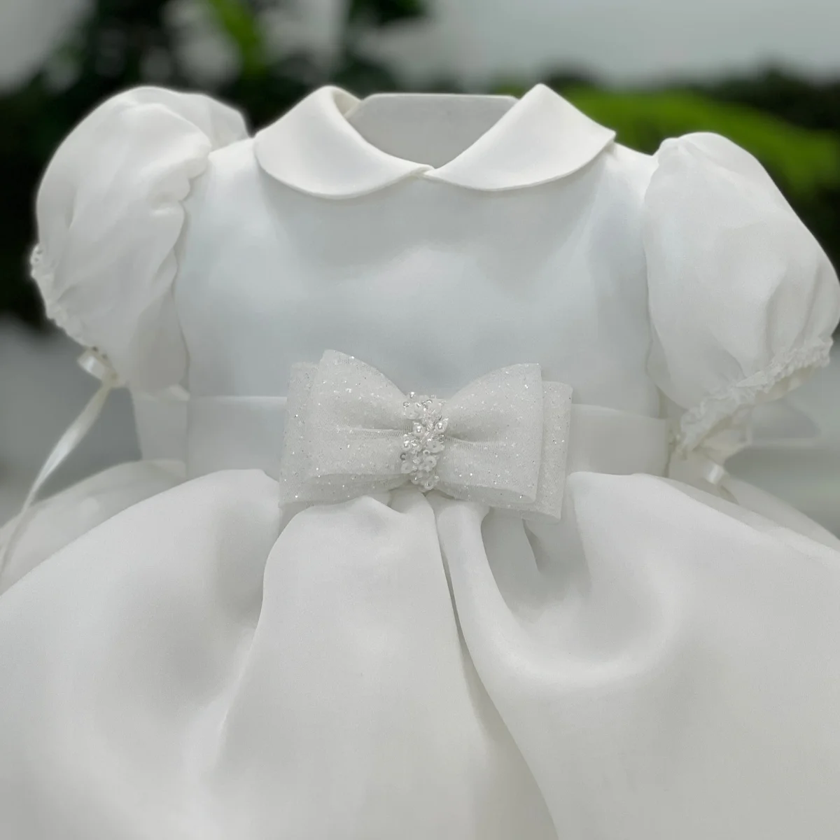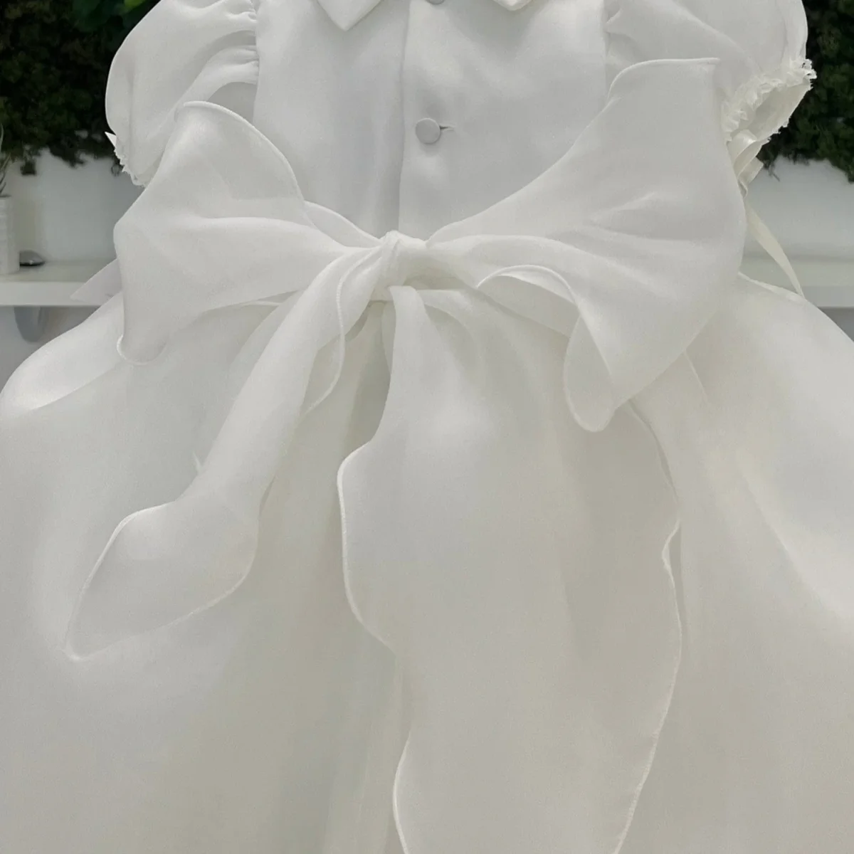 In vita, una cintura in organza si distingue per un fiocco rigido che aggiunge struttura e definizione al design. Sul retro, un morbido fiocco in organza cade delicatamente, completando l’abito con un contrasto tra rigidità e leggerezza. Questo abito è pensato per dare un tocco principesco al battesimo, unendo raffinatezza e dolcezza.