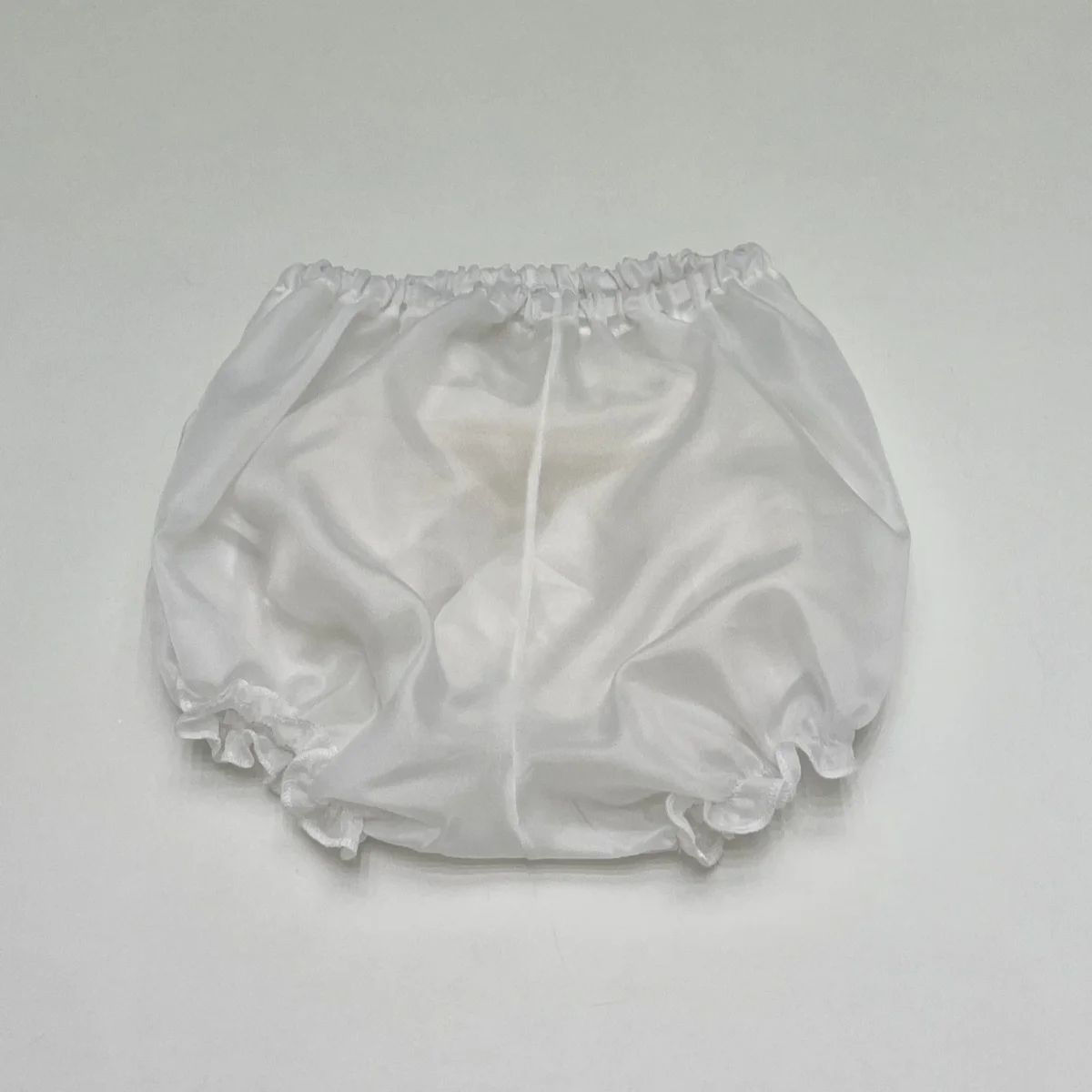 L’abito battesimale include anche manicotti coordinati e una culotte copri pannolino abbinata, che completano l’outfit della neonata per il giorno speciale del battesimo.