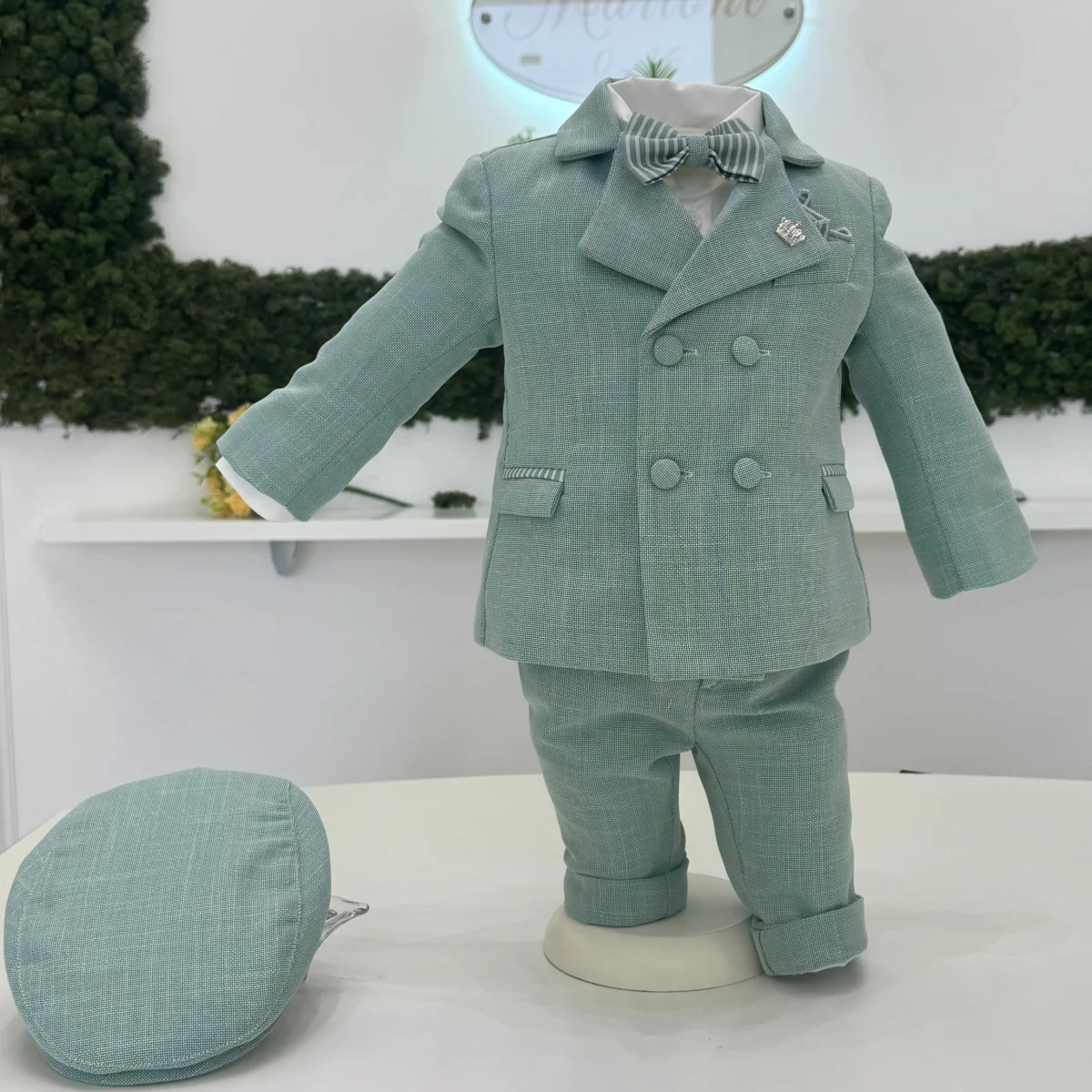 Completo cerimonia artigianale in raffinata tonalità verde salvia, composto da giacca doppiopetto, gilet a righe coordinato, camicia, pantalone con risvolto, papillon abbinato. Linee sartoriali e tessuto dall’effetto naturale valorizzano un’eleganza ricercata, perfetta per battesimo e cerimonie speciali. Un capo esclusivo, curato nei dettagli, che esprime stile e personalità con un tocco distintivo.