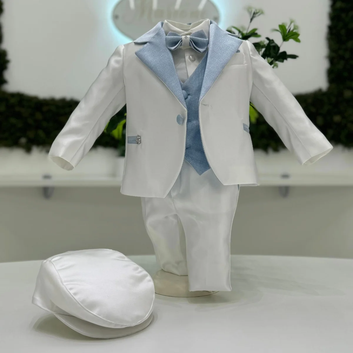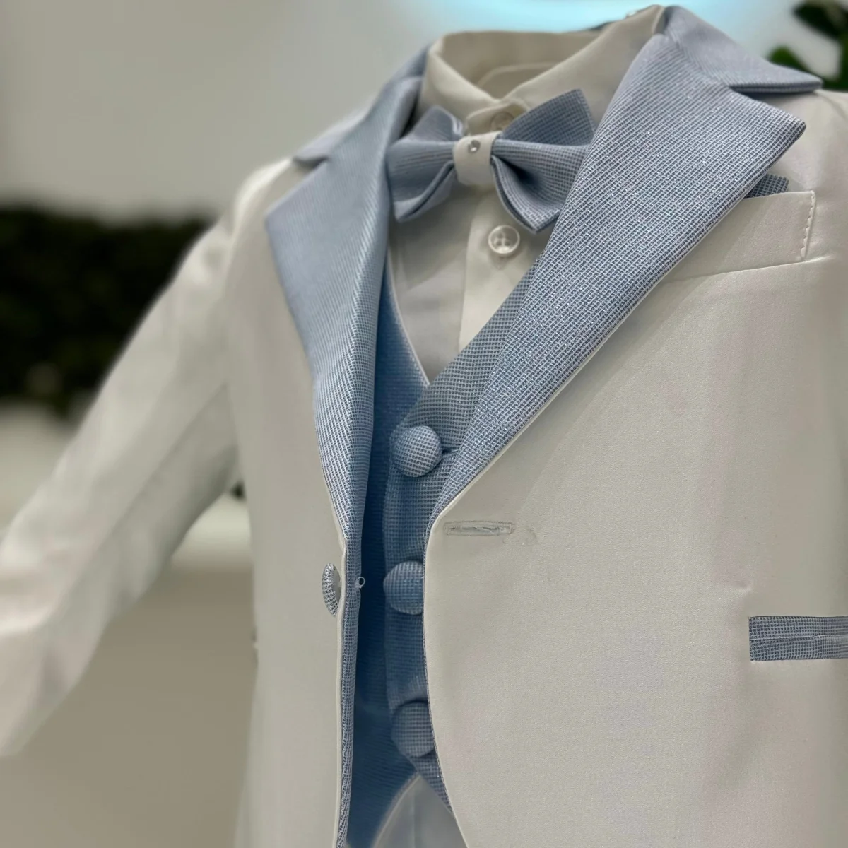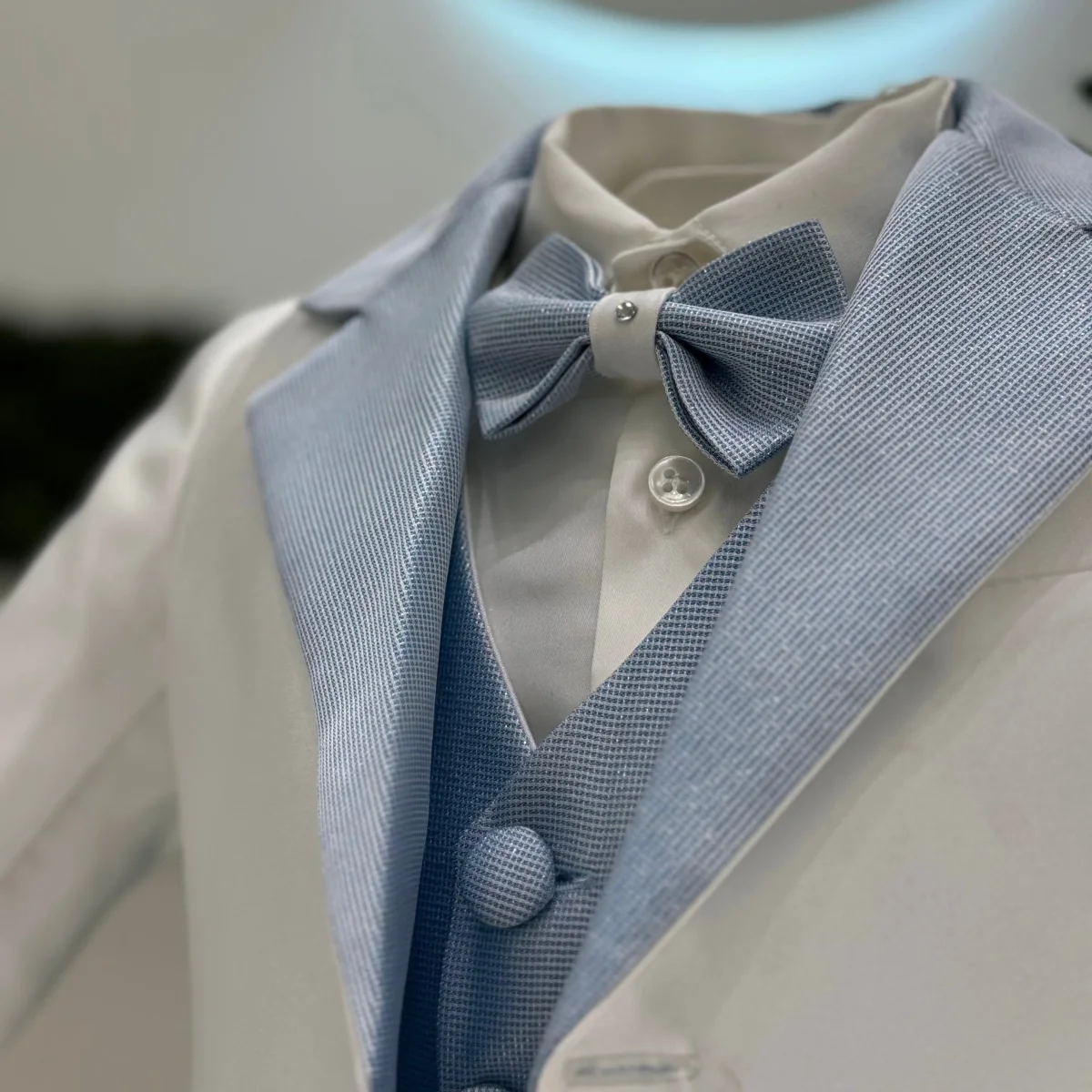 Abito battesimale composto da giacca bianca in mikado con reverse e bottoni in lurex celeste. Pantalone slim fit classico in mikado bianco, gilet in lurex e papillon con dettaglio gioiello.