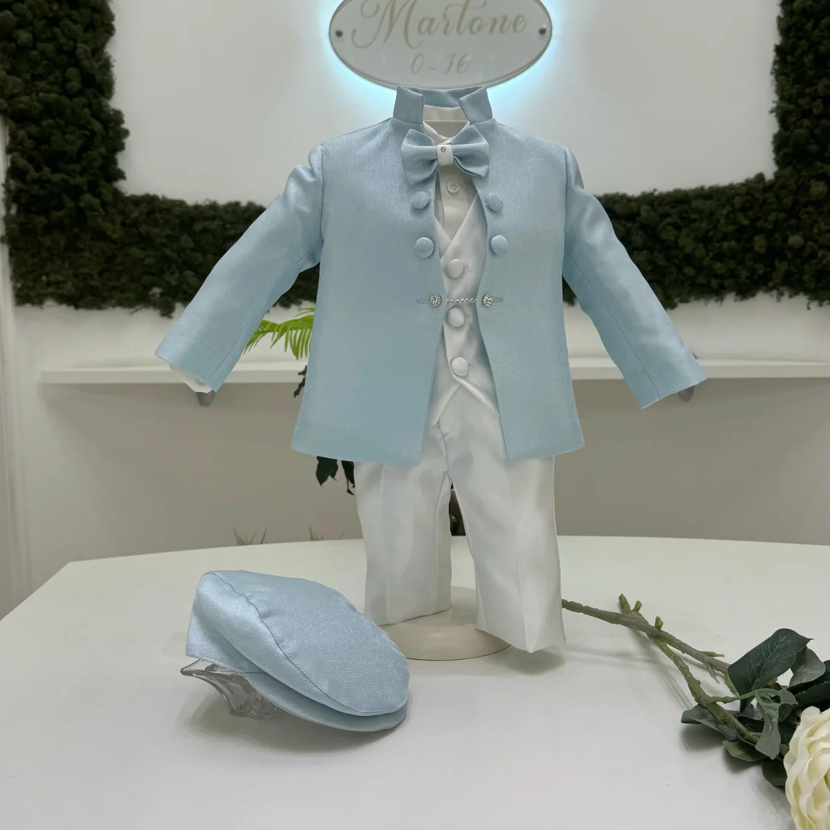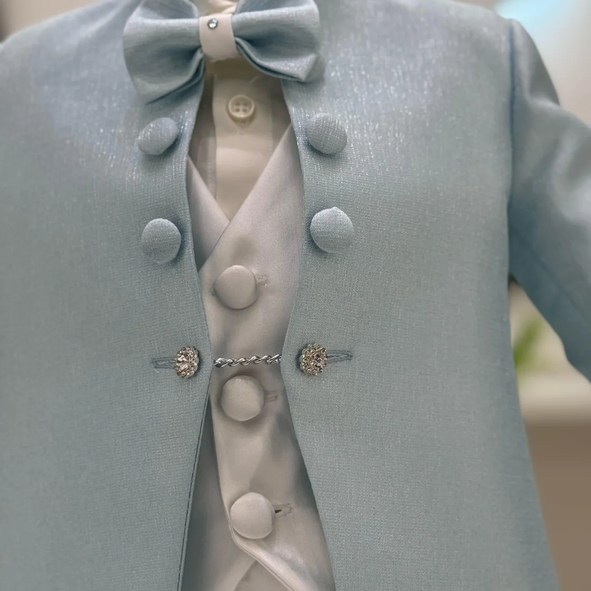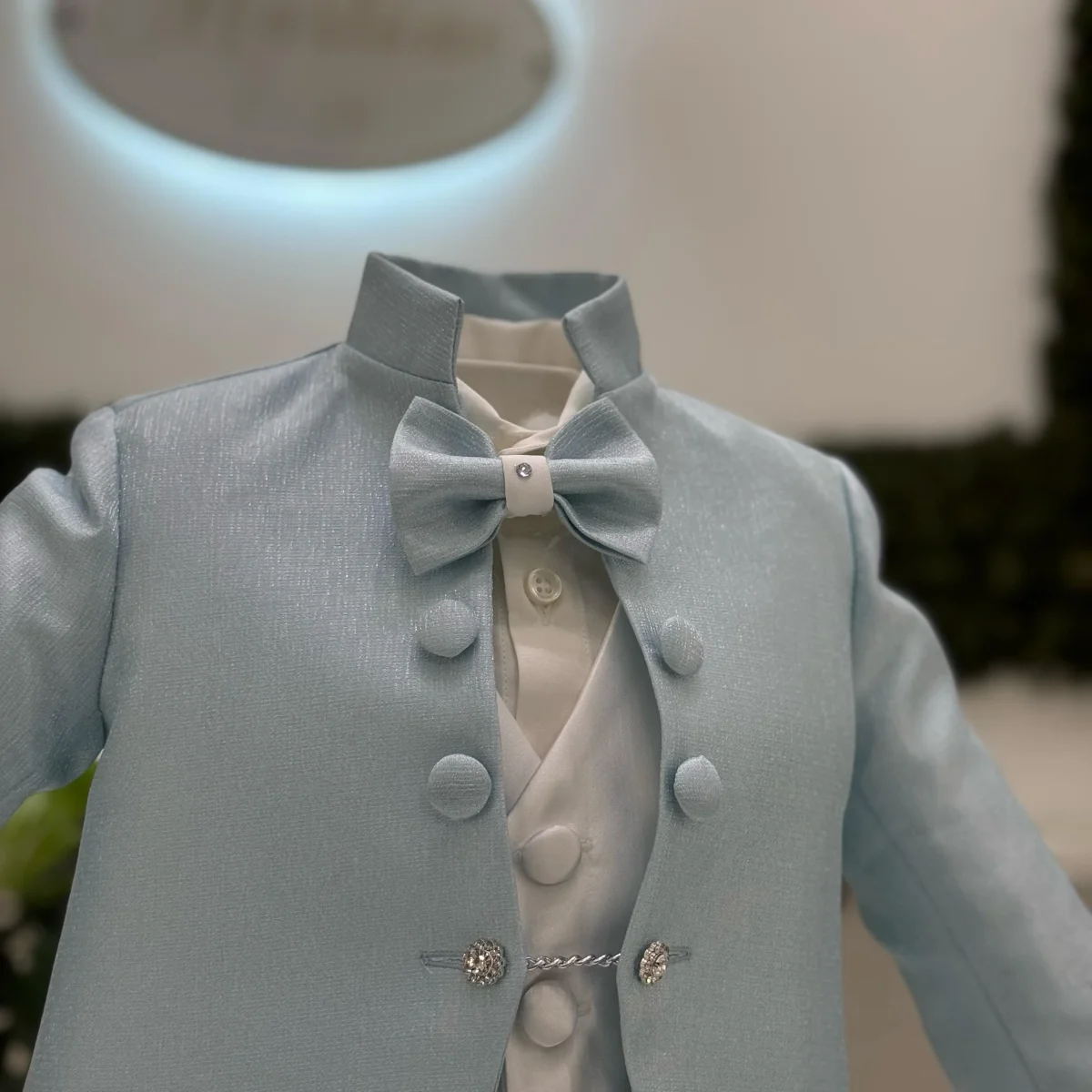 Un abito battesimale elegante e luminoso, perfetto per un’occasione speciale. La giacca celeste dal taglio coreano, realizzata in un tessuto pregiato con microglitter discreti che catturano la luce, è arricchita da bottoni rivestiti con dettaglio gioiello, per un tocco di raffinatezza. Il completo è armoniosamente bilanciato dal pantalone e dal gilet in tessuto bianco dall’effetto satinato, che donano eleganza e struttura. La camicia in cotone bianco assicura comfort e freschezza, mentre il papillon coordinato, impreziosito da un punto luce, completa il look con uno stile ricercato e sofisticato.