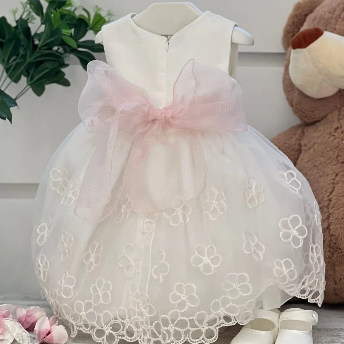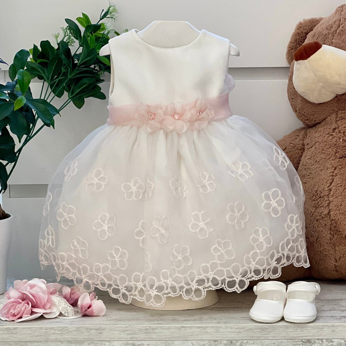 Abito battesimale in organza con ricami floreali e cintura con fiocco.