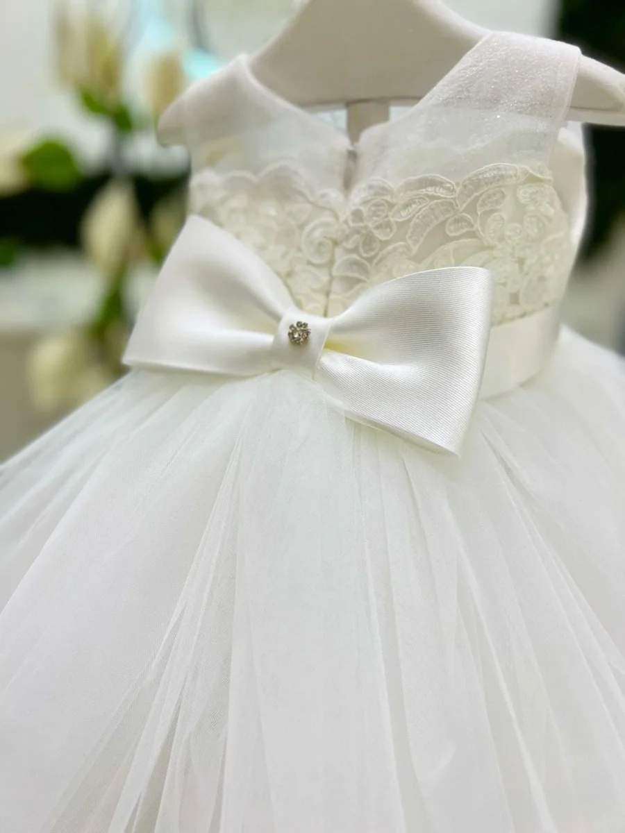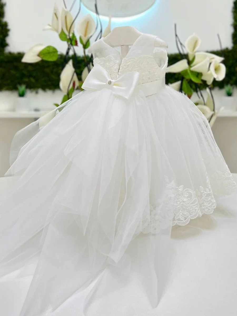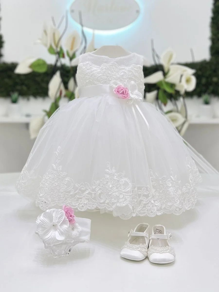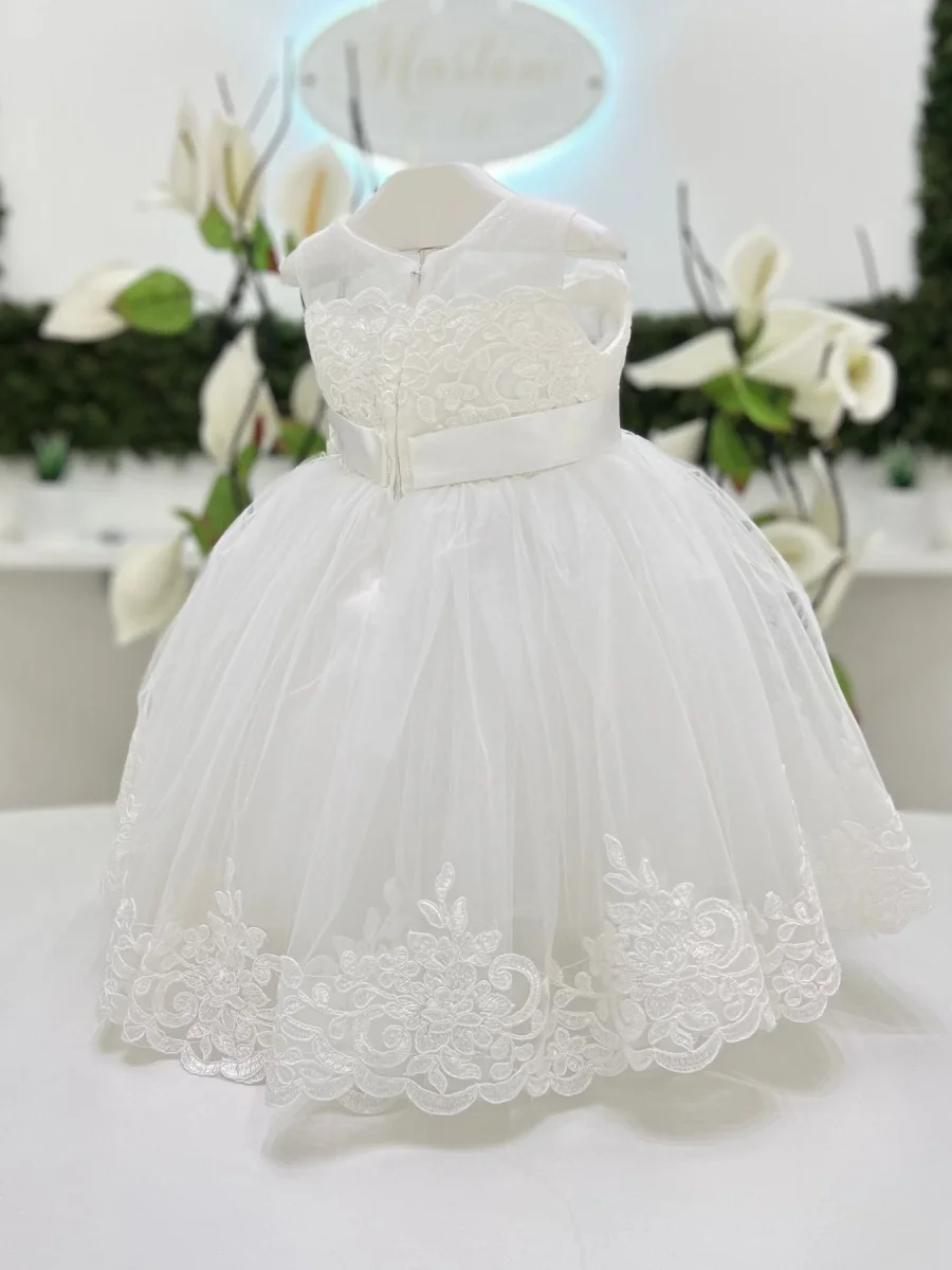 Sogna con noi scegliendo per la tua piccola l’incanto di un abito battesimale con manica a giro in tulle glitterato e merletto che rifiniscono il suo corpetto; gonna in tulle vaporosa con coda removible con balza di merletto rifinita sull’orlo, accompagnata da un vistoso fiocco rigido in mikado con dettaglio gioiello e completato da una delicata nota rosa, data dall’applicazione floreale con dettaglio gioiello.