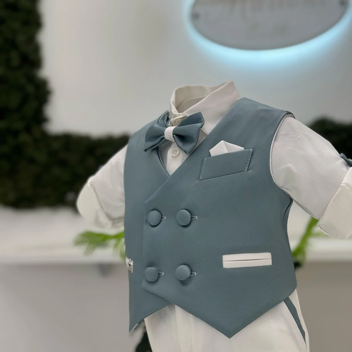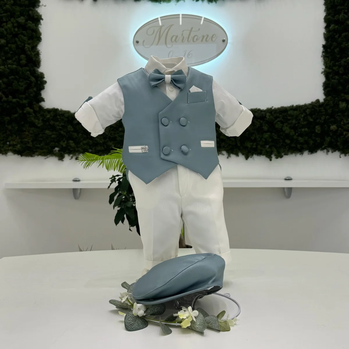 Un abito battesimale dallo stile raffinato e originale, perfetto per un’occasione speciale. Il protagonista è il gilet doppiopetto in mikado verde, impreziosito da profili bianchi a contrasto, che ne esaltano l’eleganza e la ricercatezza sartoriale. Il pantalone coordinato, con risvolto bianco, crea un equilibrio armonioso tra tonalità e dettagli. La camicia in cotone bianco con risvolti aggiunge un tocco di freschezza, mentre il papillon abbinato, perfettamente in sintonia con il gilet, completa l’outfit con un’eleganza esclusiva.