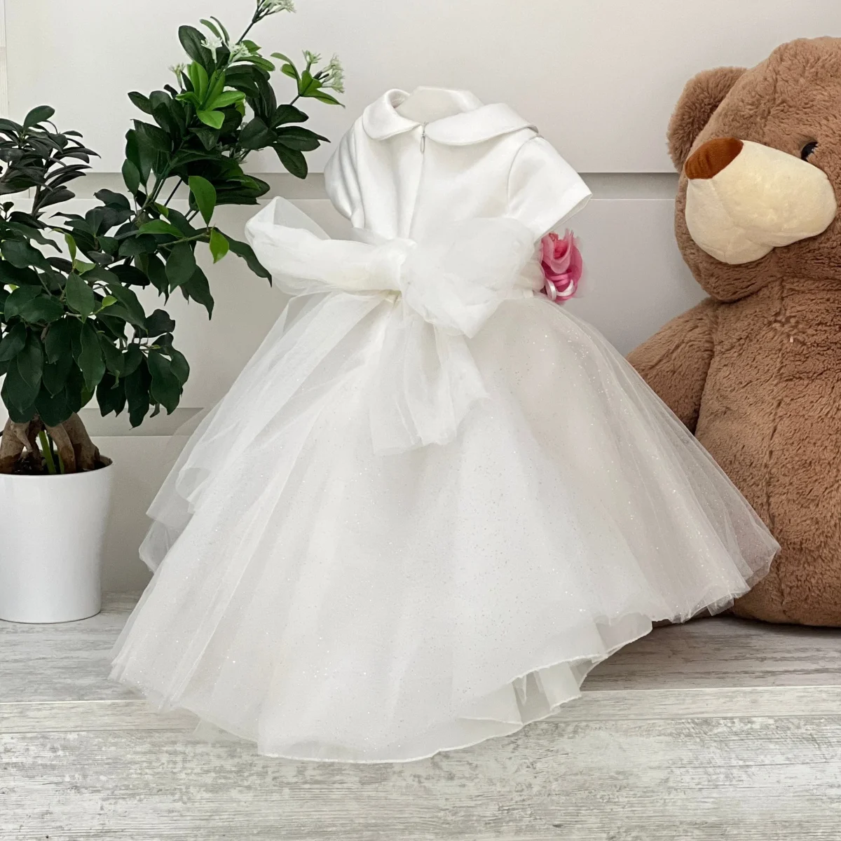 Abito battesimale con coda, realizzato con doppio strato di tulle e glitter, corpino in mikado, colletto rotondo. Cintura in tulle con fiocco ed applicazione floreale