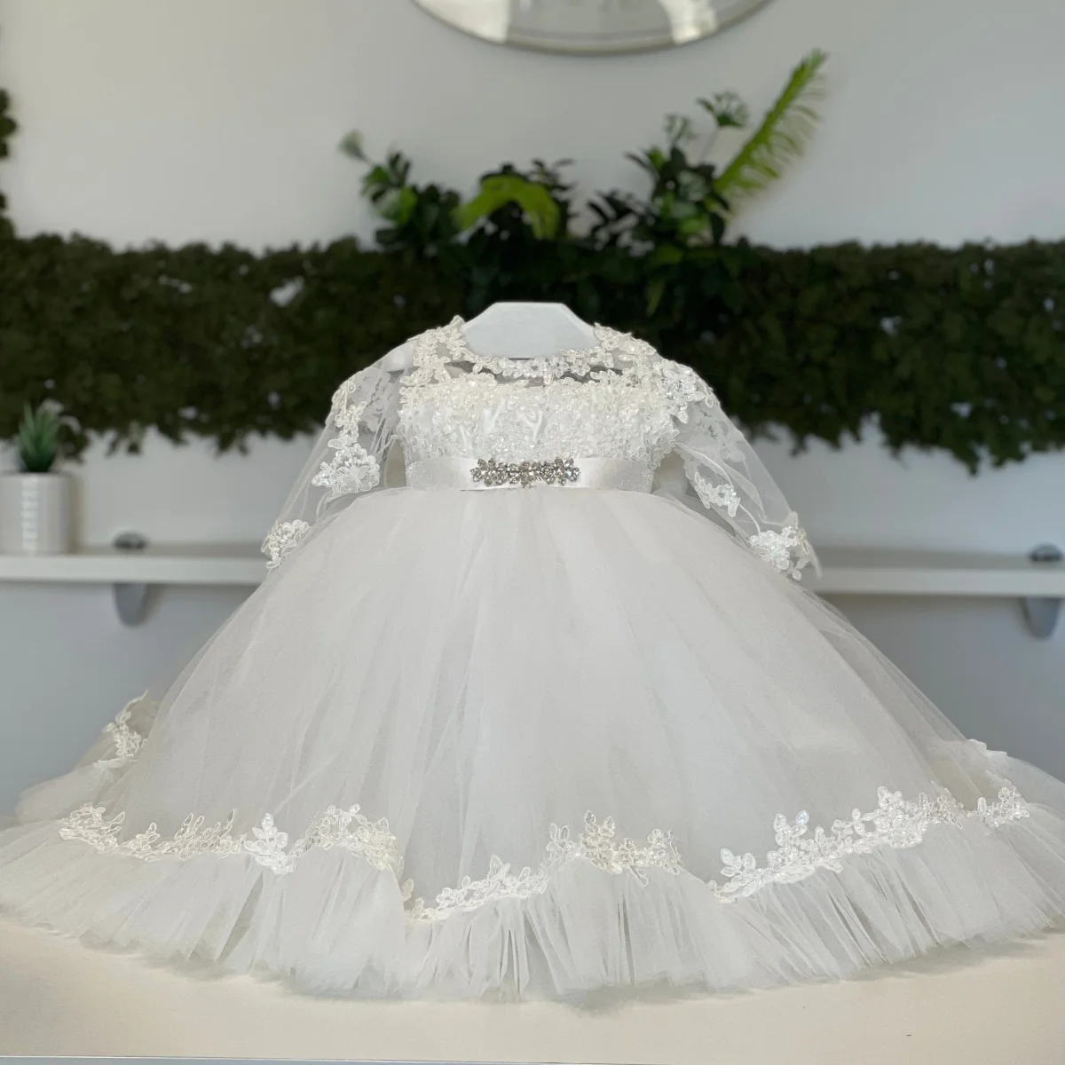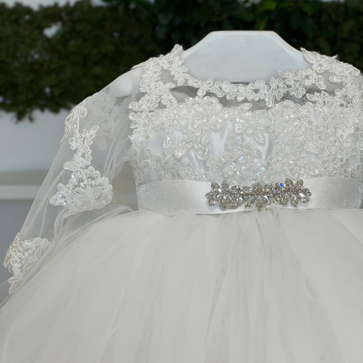 Abito battesimale sartoriale, realizzato interamente a mano per celebrare con eleganza un momento irripetibile. Tulle vaporoso, ricami floreali tridimensionali e una costruzione impeccabile: ogni dettaglio è studiato per creare un momento memorabile. Il corpino è un intreccio di perle e pizzo, definito da una cintura gioiello che segna il punto vita con precisione. Le maniche in tulle ricamato bilanciano perfettamente la silhouette. Ma è la coda — ampia, imperiale, rifinita con un maxi fiocco in raso — a dominare la scena con eleganza sovrana. Un abito che non accompagna, ma incorona.