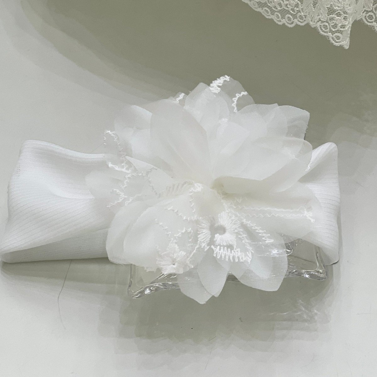 Fascia battesimale realizzata in tulle elasticizzato, impreziosita da un raffinato dettaglio floreale. Perfetta per completare con grazia l’outfit della cerimonia, aggiungendo un tocco di raffinatezza e armonia.
