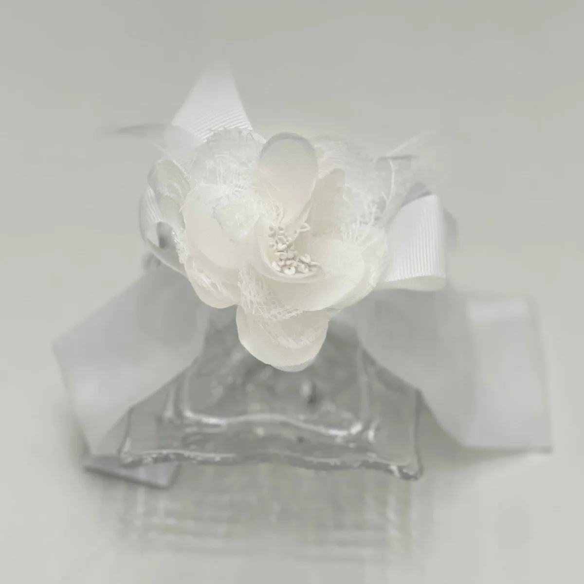 Fascia battesimale per neonata in tulle elasticizzato per neonata, con dettaglio floreale.