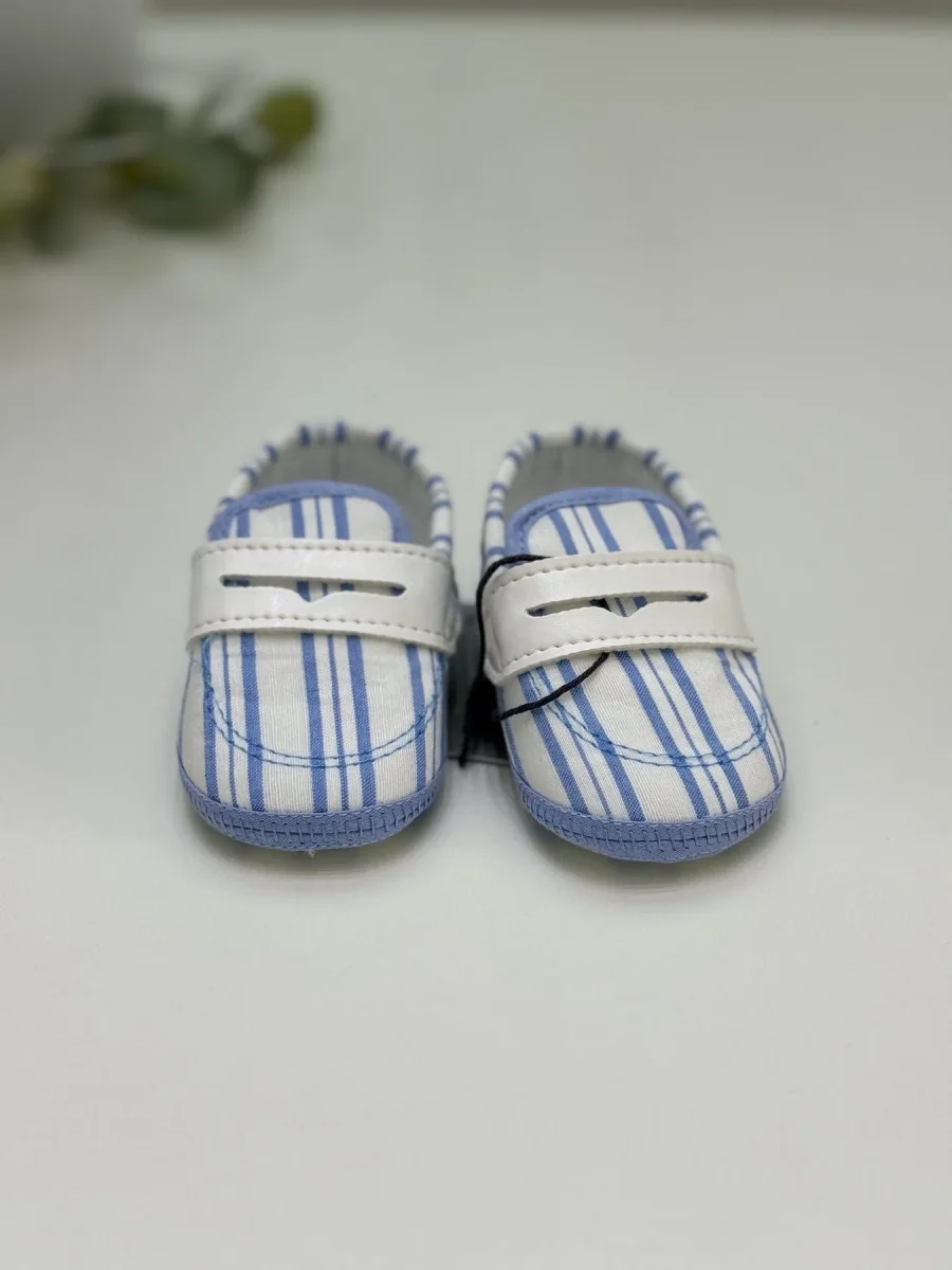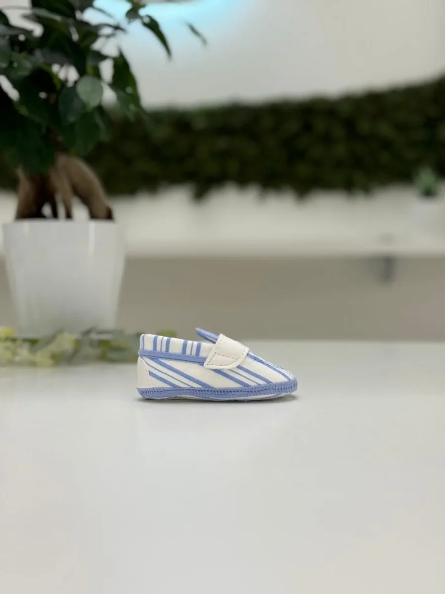 Scarpina battesimale, modello mocassino da culla in bianco e celeste