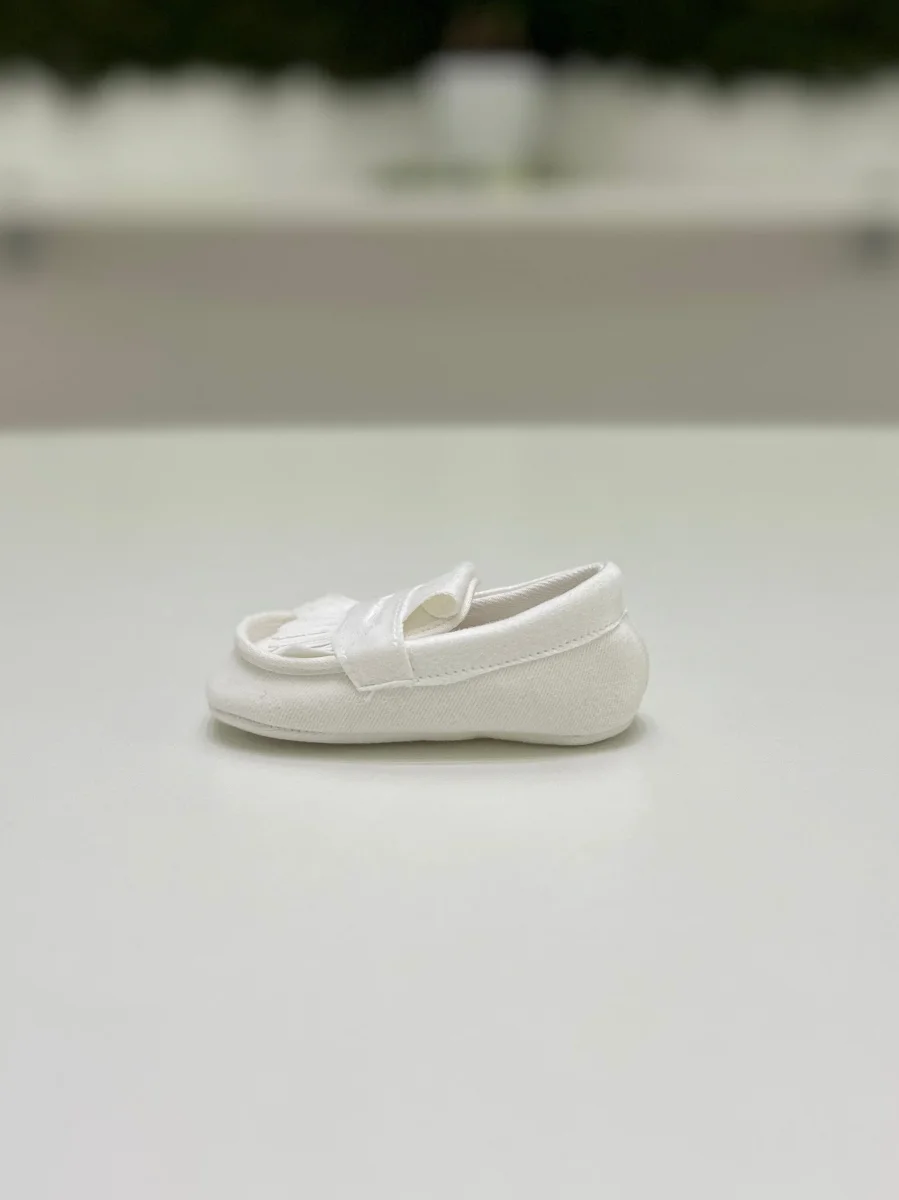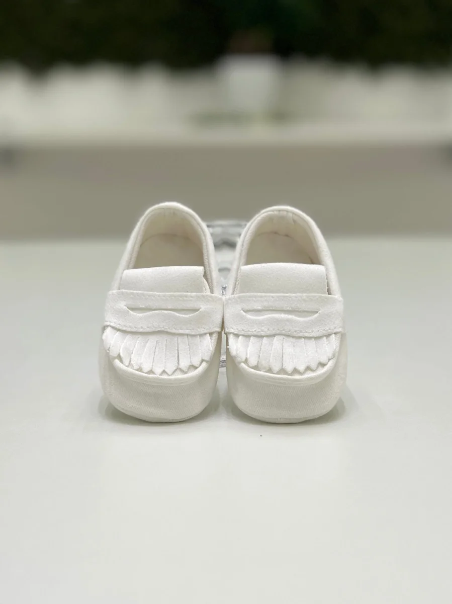 Scarpina per neonato modello mocassino scamosciato con frange.