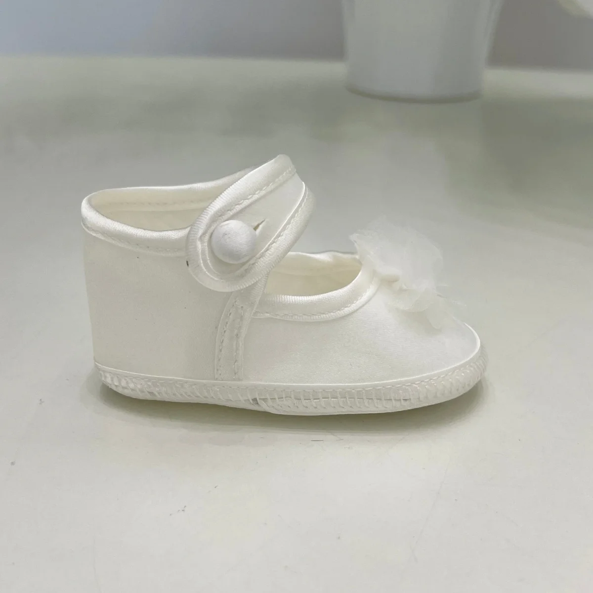 Scarpina battesimale per neonata, con chiusura con bottoncino, un accessorio elegante e studiato nei minimi dettagli per completare il look della tua piccola nel giorno del suo battesimo.