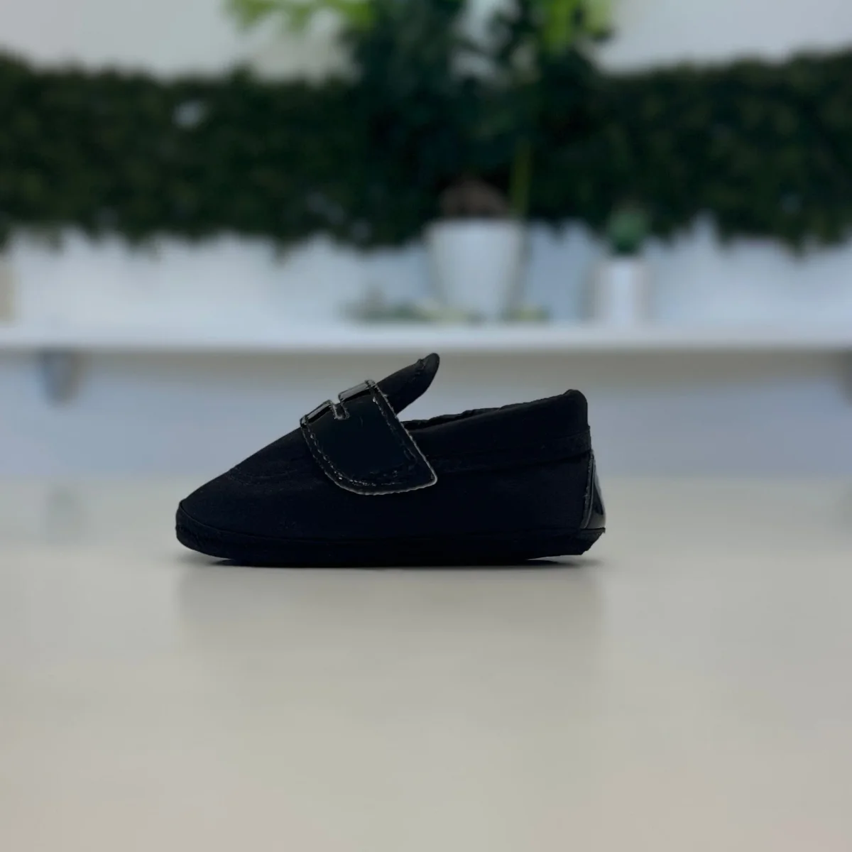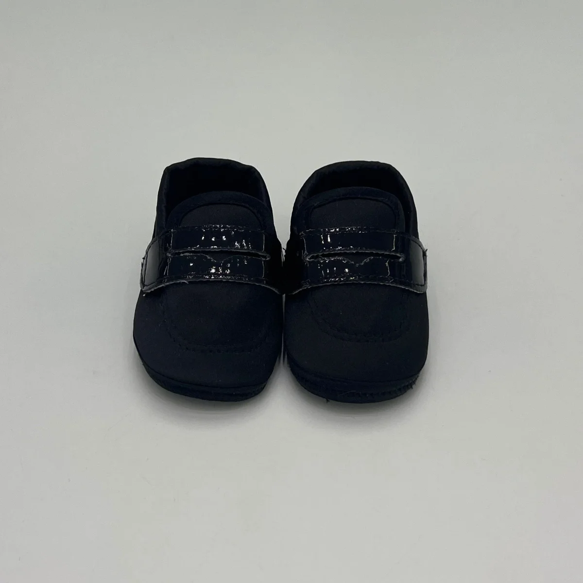 Mocassino da culla nero in morbido tessuto, con fascetta decorativa frontale. Comodo e raffinato, completa con eleganza l’abito battesimale, assicurando comfort e delicatezza per i piedini del tuo bambino.