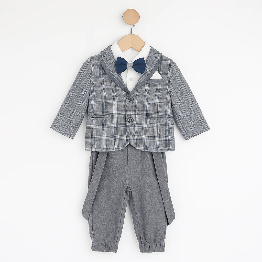 Completo elegante per neonato composto da camicia con colletto classico, papillon blu e giacca a quadri con taschini e fazzoletto decorativo. Il look è completato da pantaloni con bretelle e fondo elasticizzato. Un insieme dal fascino formale e raffinato, perfetto per cerimonie e occasioni speciali.
