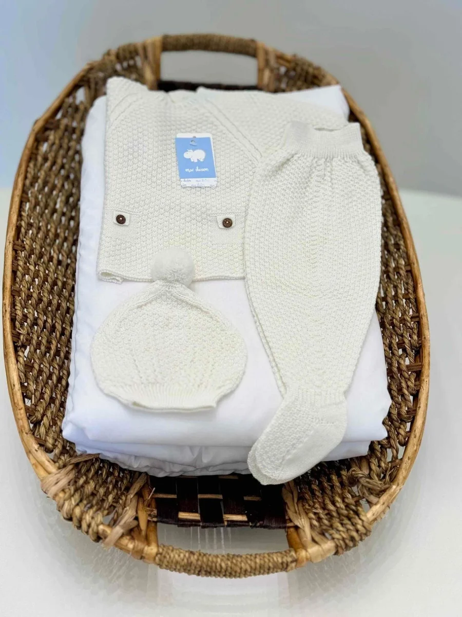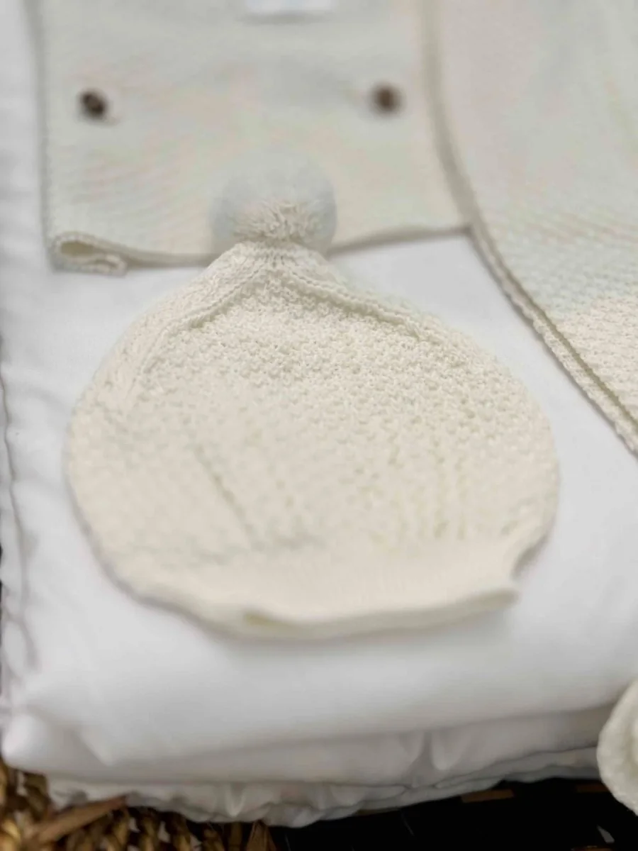 Set maglia,ghettina e cappellino con pon pon di lana