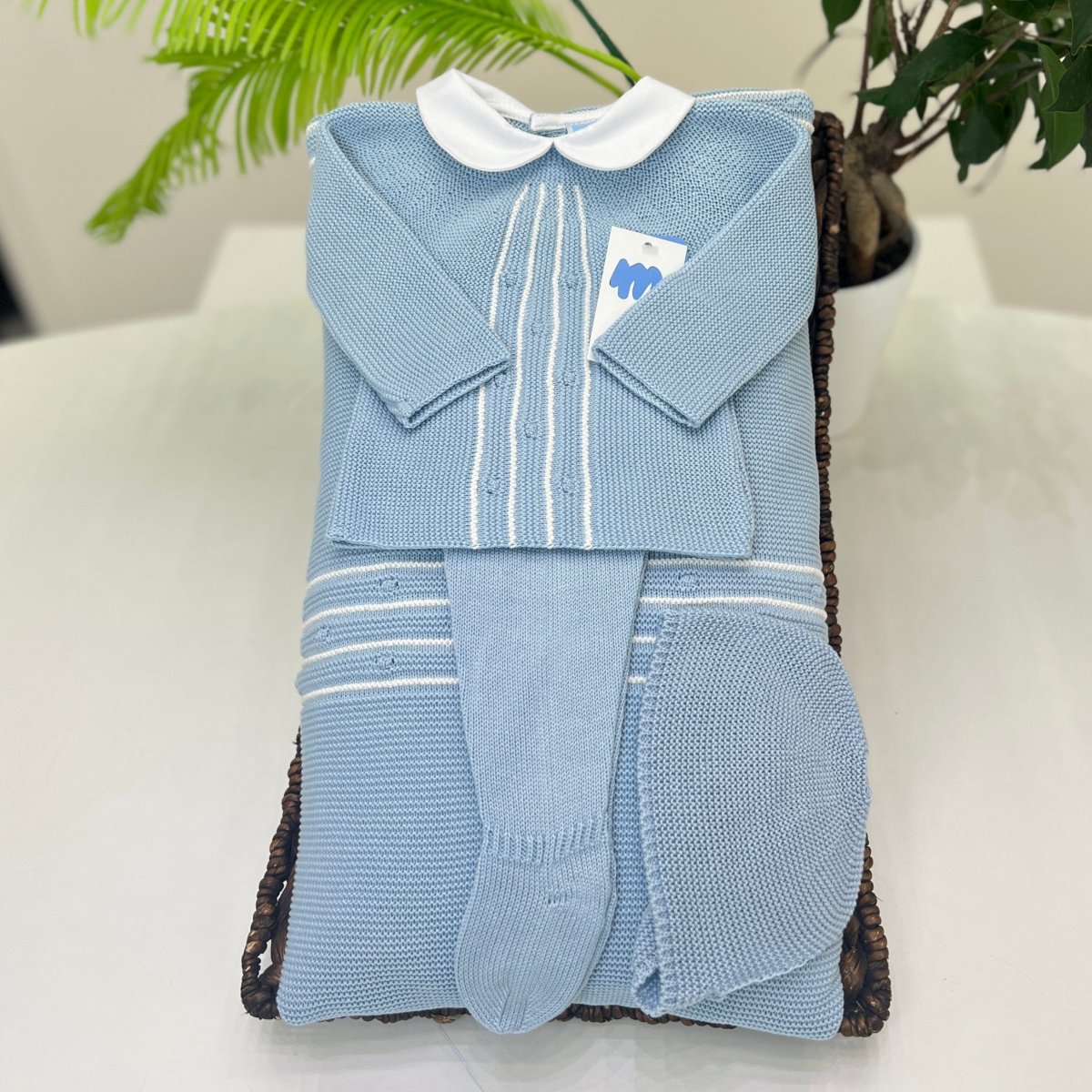 Tutina spezzata per neonato con cuffia coordinata, realizzata in morbido filo di cotone. La maglia, impreziosita da righe bianche, nodini decorativi e colletto in piquet, unisce eleganza e comfort. L’abbottonatura posteriore assicura praticità, ideale per la pelle delicata dei più piccoli.
