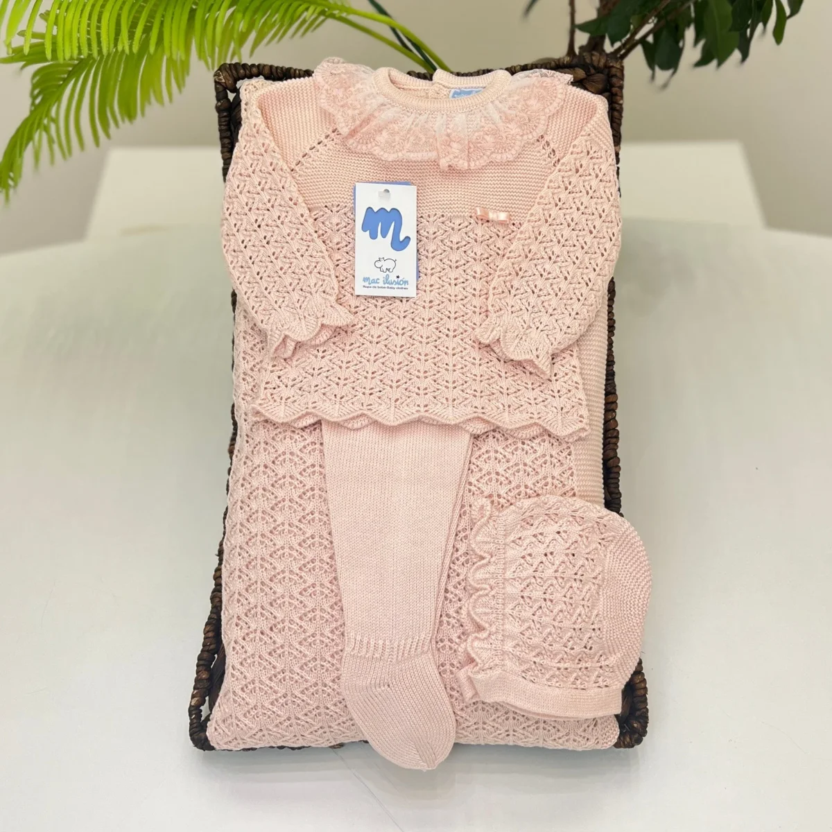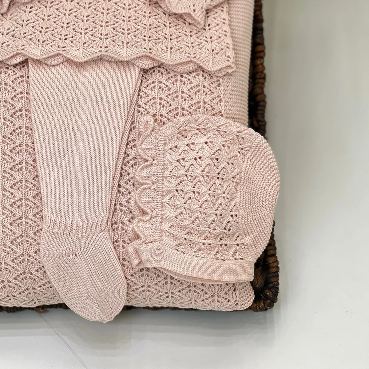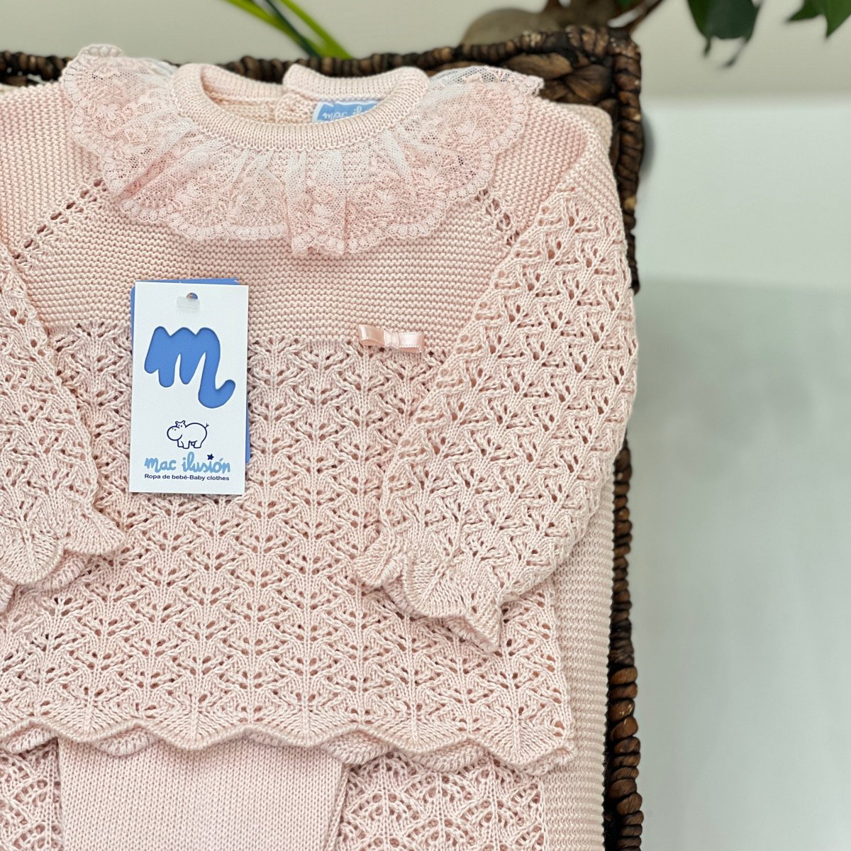 Tutina spezzata per neonato in morbido filo di cotone traforato, completa di cuffia coordinata. Il colletto con delicate rouche in tulle ricamato e un fiocchetto in raso aggiunge un tocco di eleganza esclusiva, ideale per le occasioni speciali.