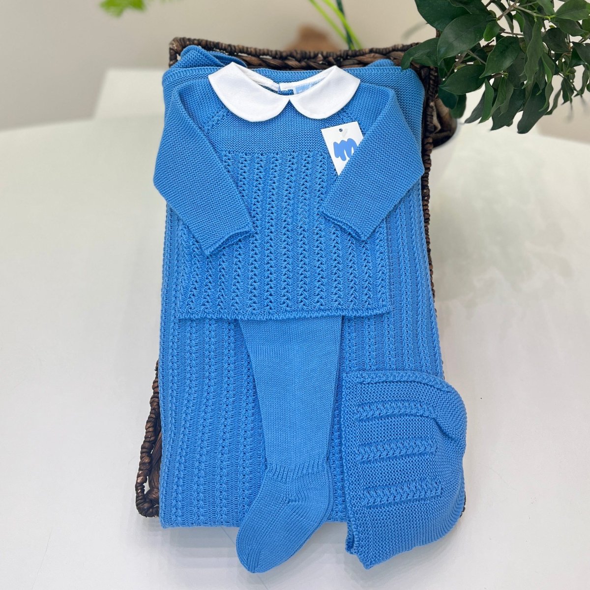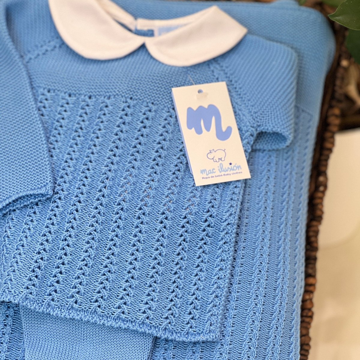 Tutina spezzata per neonato in morbido filo di cotone, caratterizzata da una raffinata lavorazione intrecciata a rilievo. Completa di colletto in piquet di cotone e cuffia coordinata, è ideale per garantire comfort e stile ai più piccoli