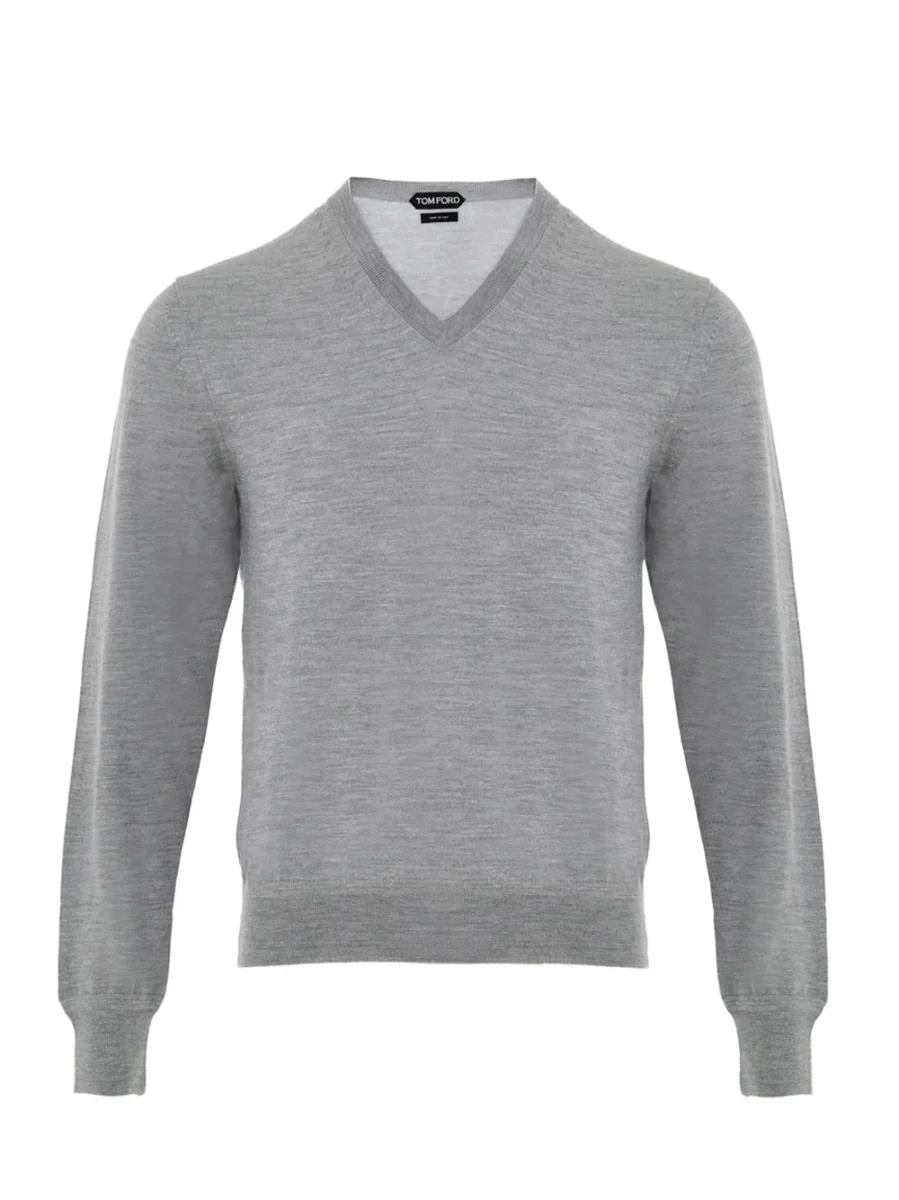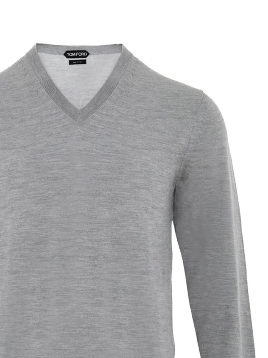 Maglia Grigia con Scollo a V in Cashmere e Seta Tom Ford. In grigio perla, leggera e morbida al tatto, scollo a V, maniche lunghe, linea classica.
