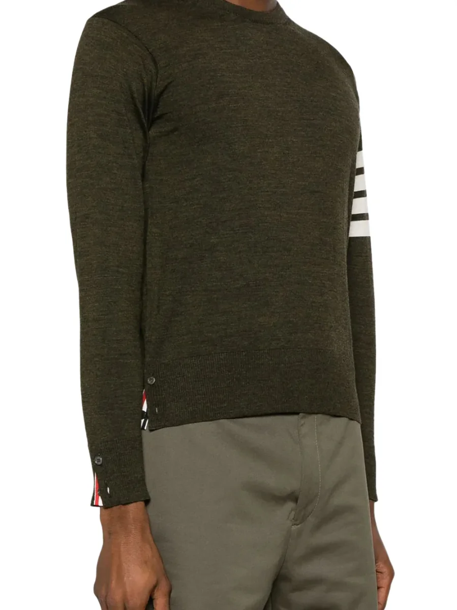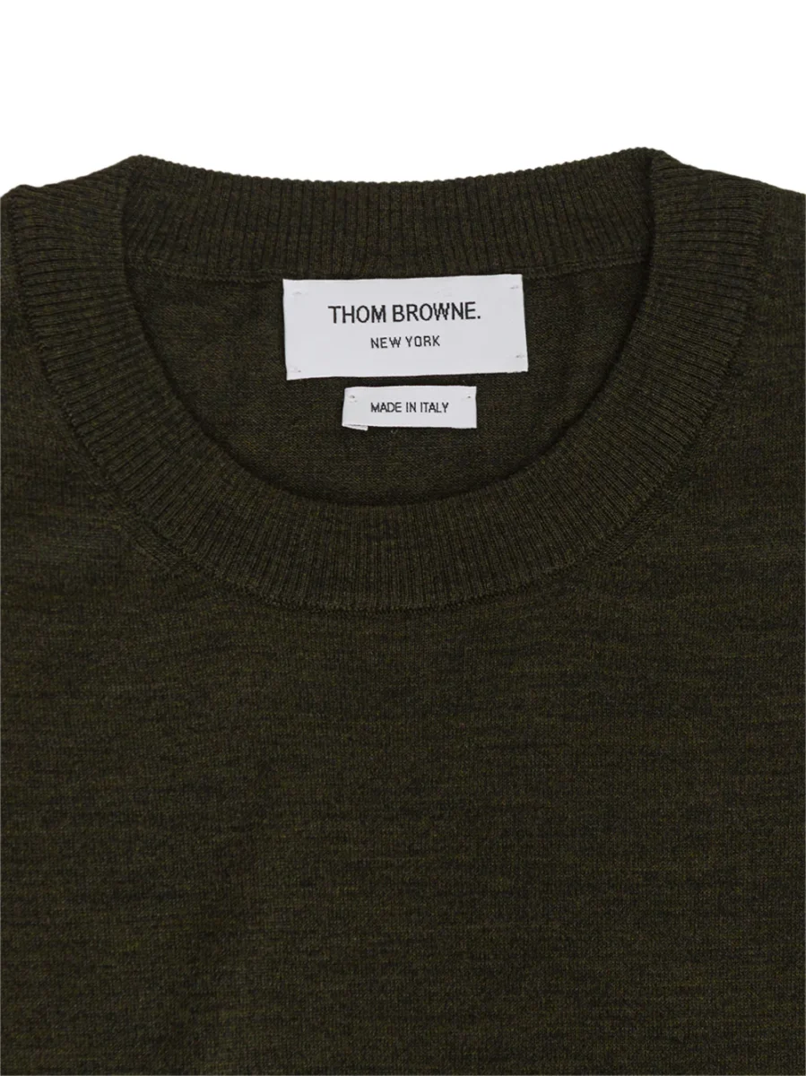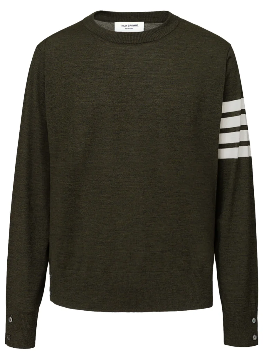 Maglione girocollo Thom Browne, in verde scuro con dettaglio a 4 barre su manica.