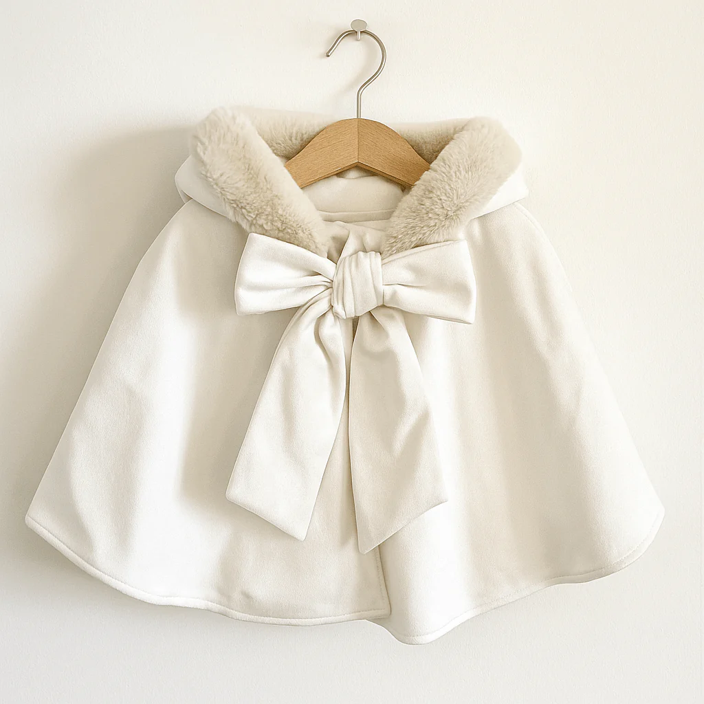 Mantella in panno, con cappuccio foderato in ecopelliccia e maxi fiocco applicato sul davanti. Un modello elegante e avvolgente, perfetto per cerimonie e occasioni speciali.
