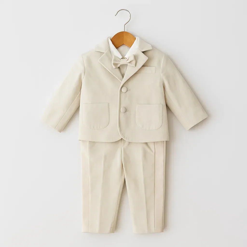 Completo elegante per neonato composto da camicia con colletto classico, papillon tono su tono e giacca crema con bottoni rivestiti e tasche arrotondate. I pantaloni coordinati, con piega centrale e linea pulita, completano l’insieme con un’eleganza essenziale e raffinata. Un look impeccabile, ideale per cerimonie e occasioni speciali.