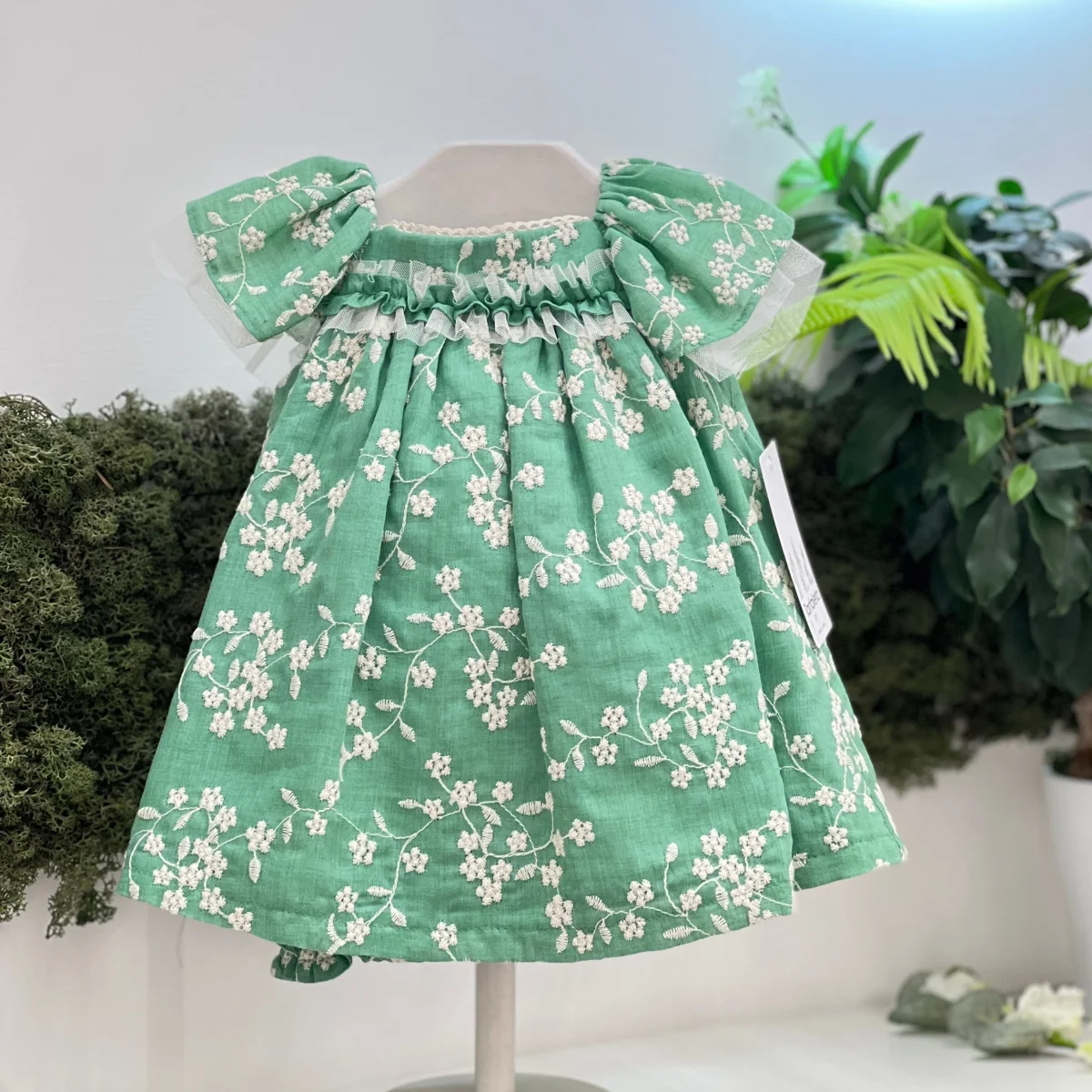 Abito con culotte in cotone con ricami floreali beige, manica ad aletta e abbottonatura sul retro con fiocco.
