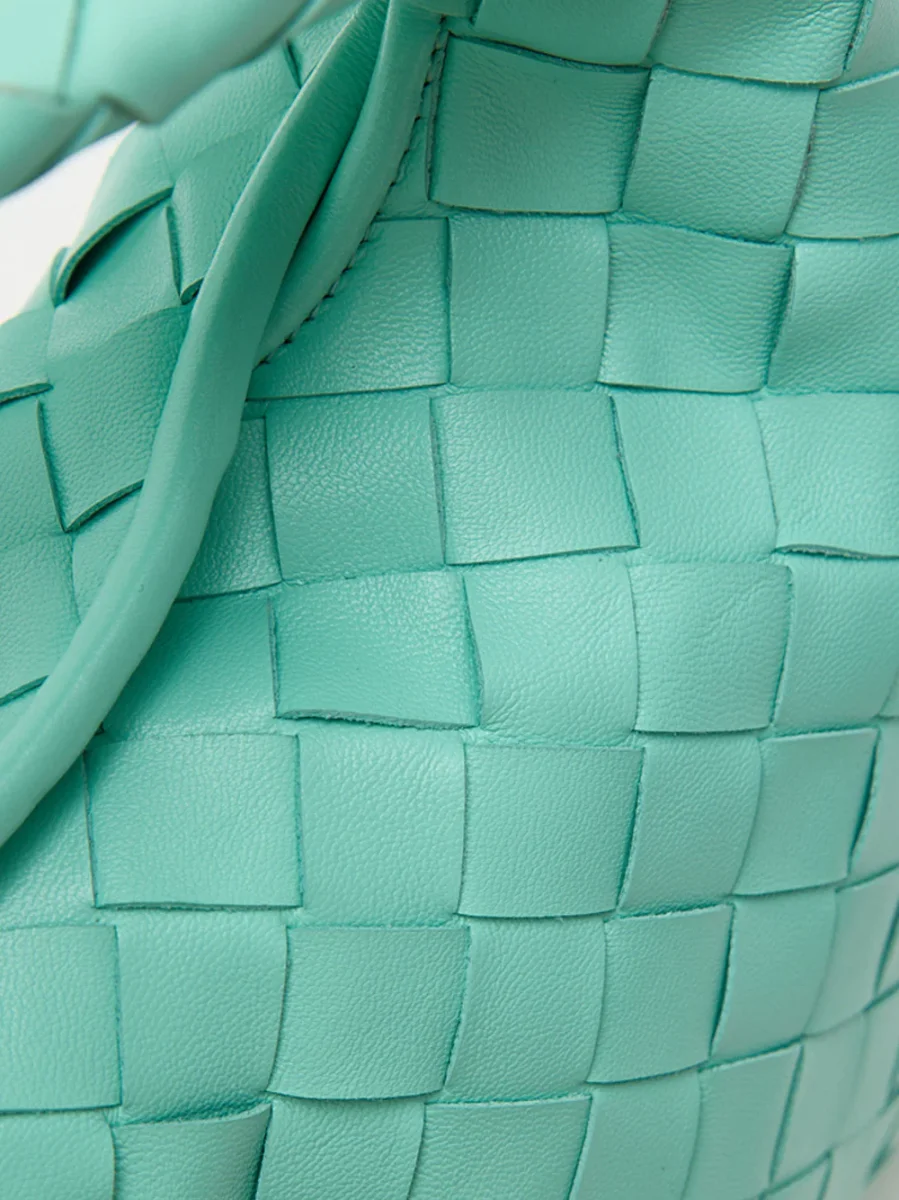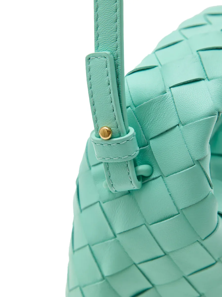 Mini Borsa a Spalla Hop con Intreccio in Turchese Bottega Veneta. A tracolla, unico scomparto e manico singolo, lavorazione intreccio allover. Tracolla removibile