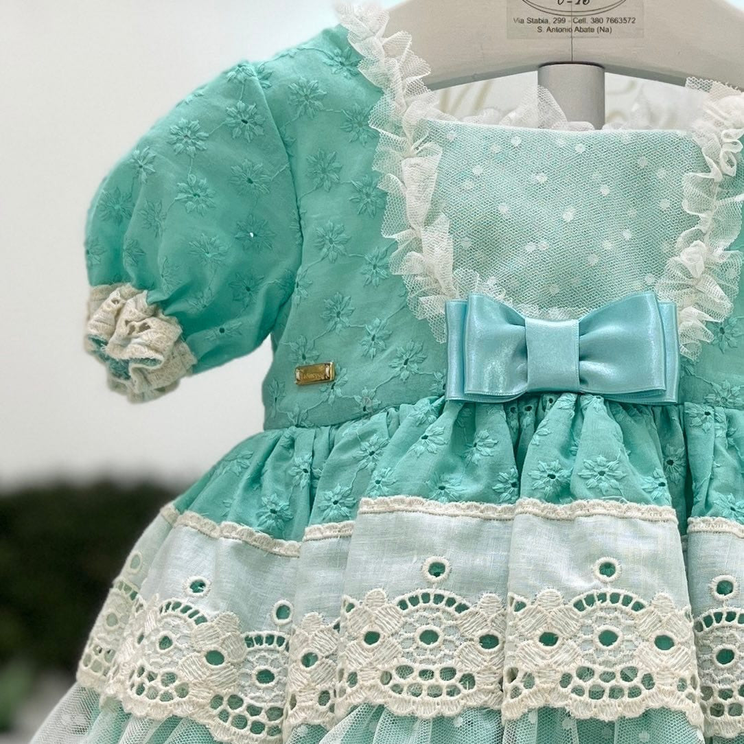 Mini abito bimba con culotte, in pizzo sangallo e gonna con doppia balza, manica a palloncino e fiocchetti in raso.