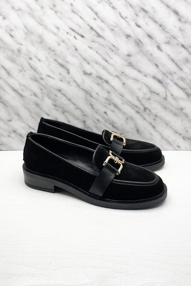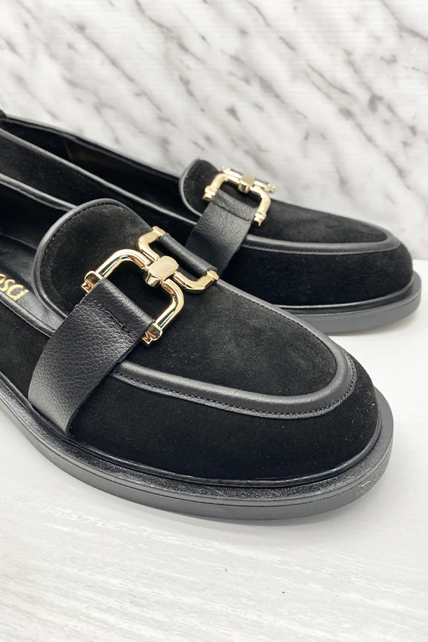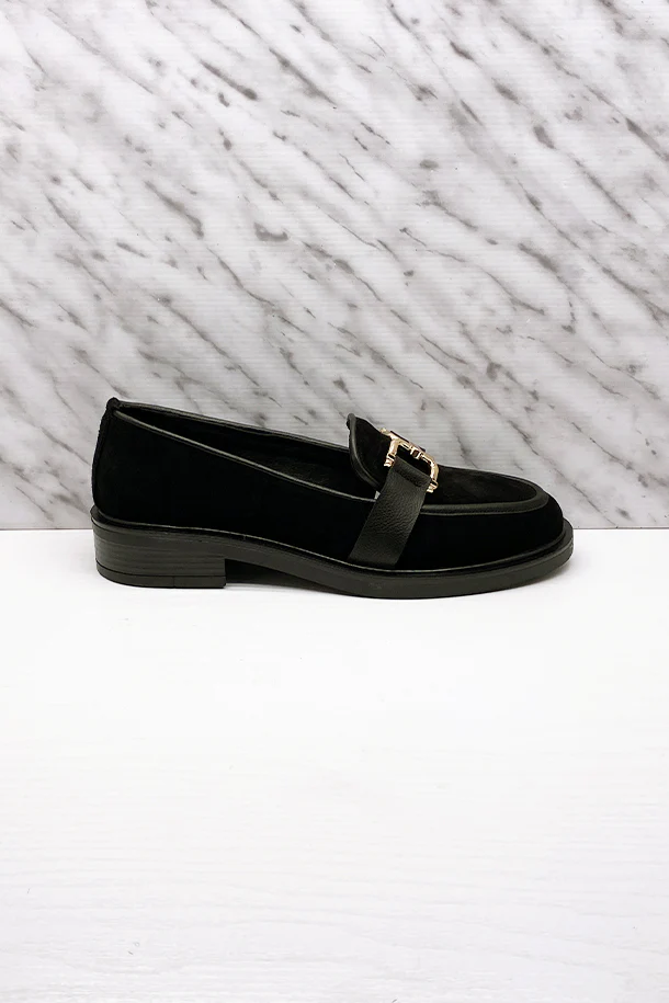 Mocassini slip on in pelle scamosciata solid color con profilo in tinta, fascia frontale con fibbia metallica, suola interna in pelle con inserto memory, suola classica in gomma