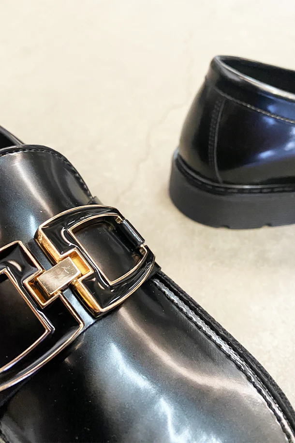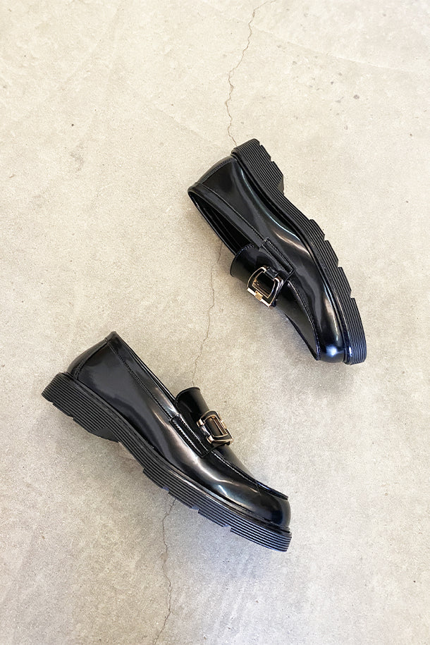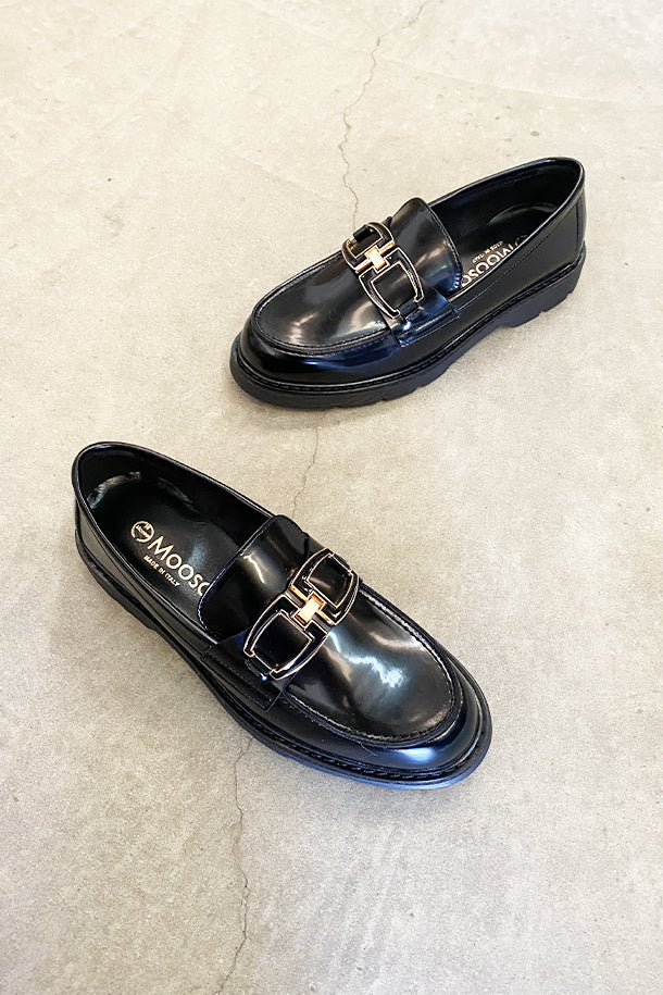 Mocassini a punta curva in eco pelle tinta unita, fibbia decorativa in metallo smaltato, suola interna in pelle, fondo in gomma scanalato a carrarmato