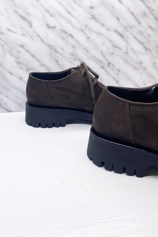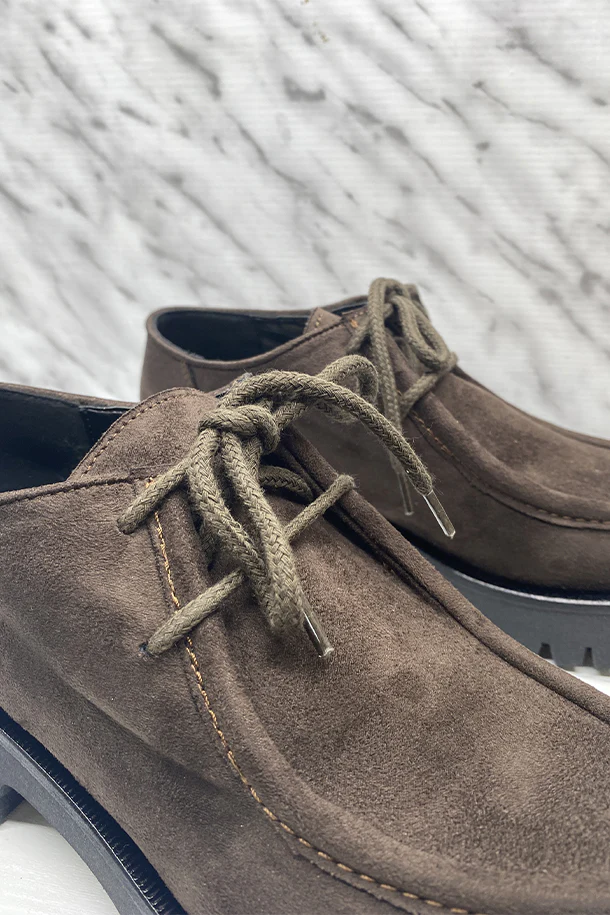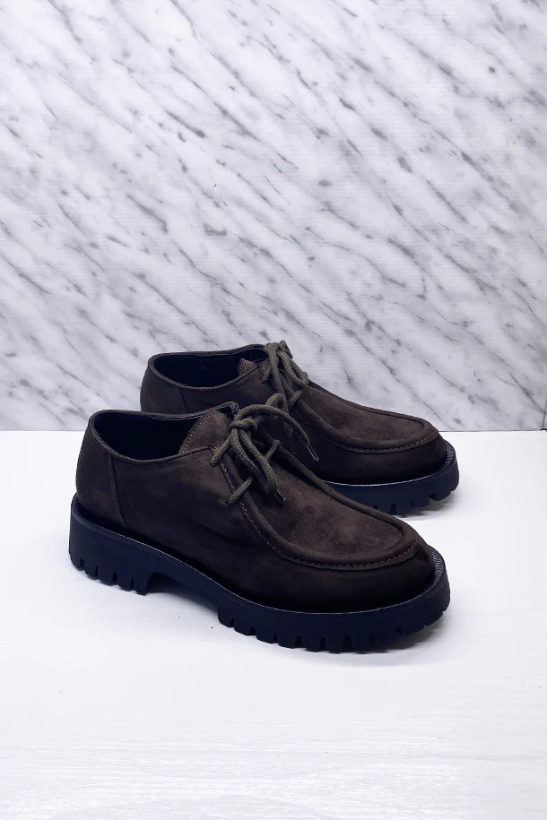 Mocassini in eco pelle finitura camoscio con impunture in tinta, lacci in tinta, suola interna in pelle, suola in gomma a carrarmato