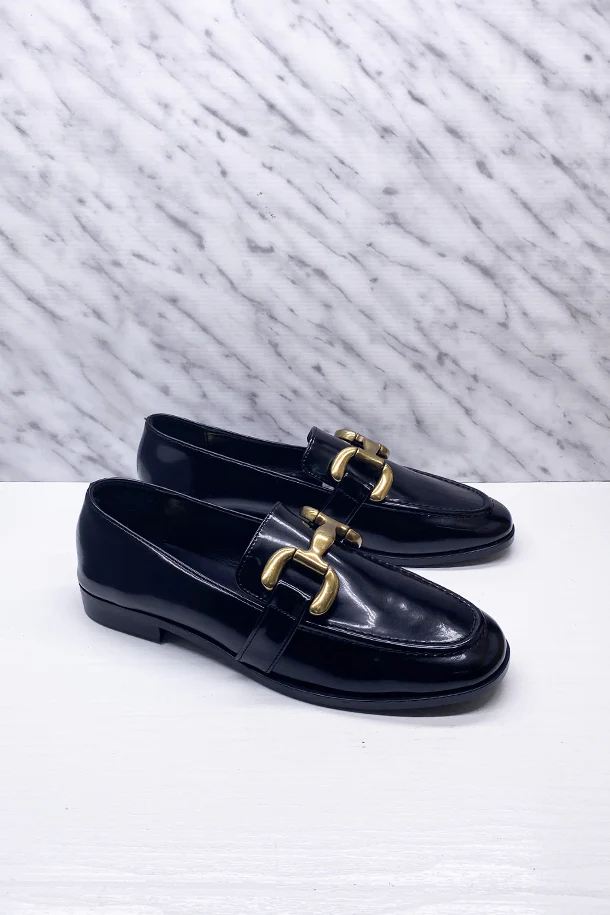 Mocassini slip on in eco pelle lucida con fibbia metallica di decorazione, suola interna in pelle, suola esterna in gomma
