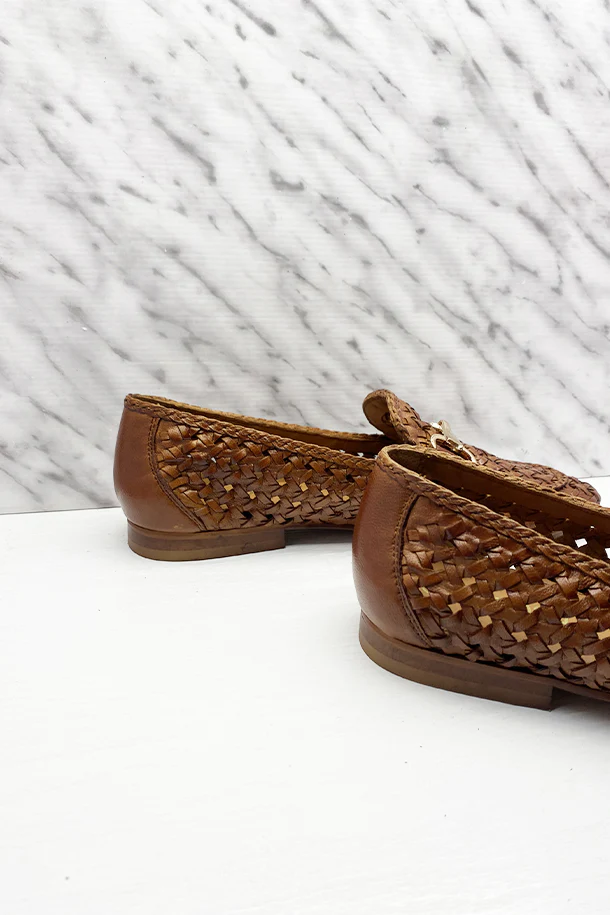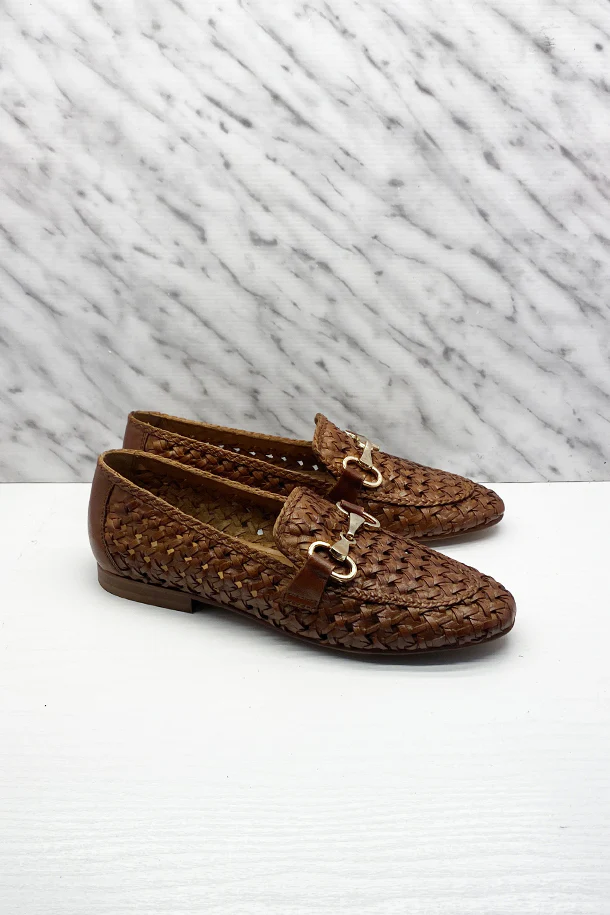 Mocassini slip on in pelle solid color a trama intrecciata, fibbia metallica frontale, suola flat in gomma