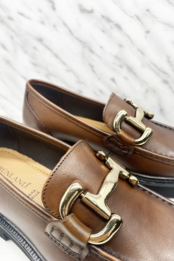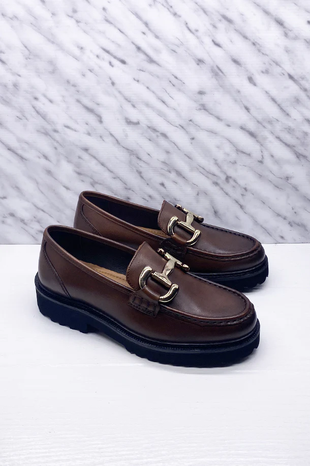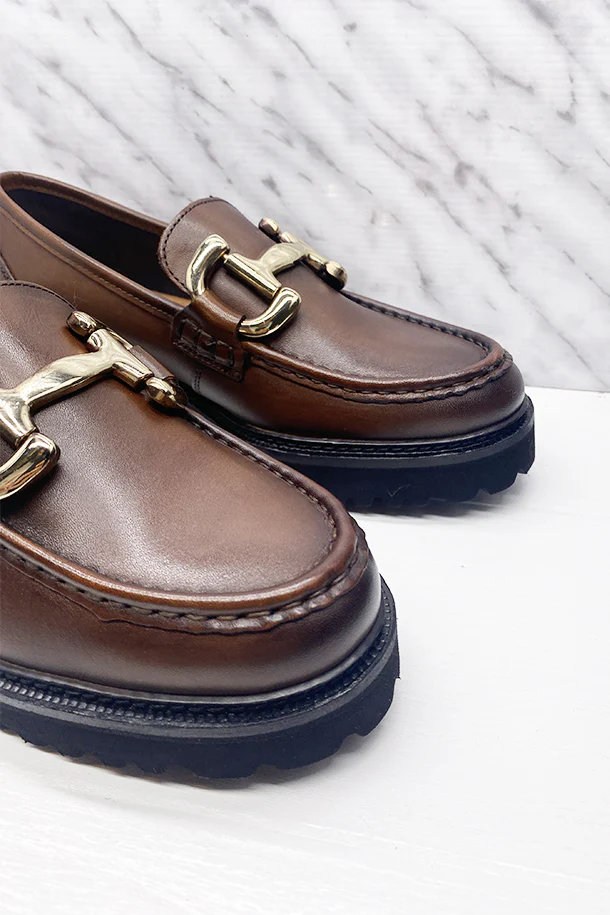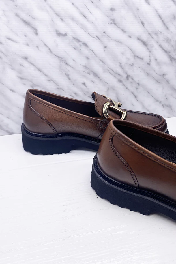 Mocassini slip on in pelle con fibbia metallica decorativa, impunture in tinta, suola in gomma a carrarmato