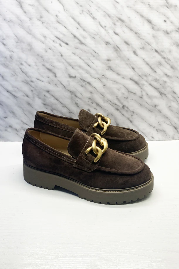 Mocassini slip on in camoscio con catena decorativa in metallo anticato, impunture in tinta, suola in gomma a carrarmato