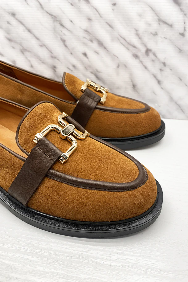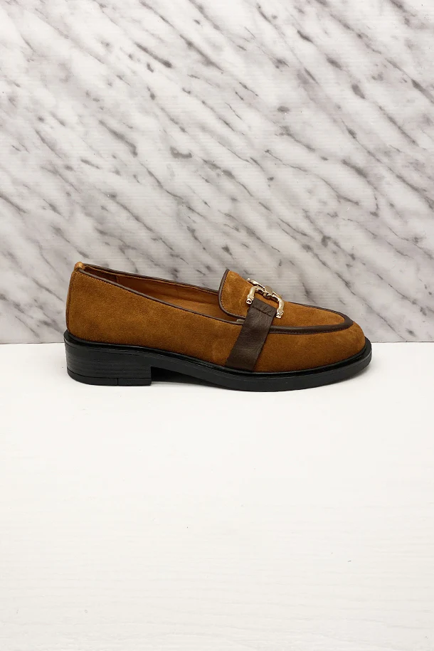 Mocassini slip on in pelle scamosciata solid color con profilo in tinta, fascia frontale con fibbia metallica, suola interna in pelle con inserto memory, suola classica in gomma