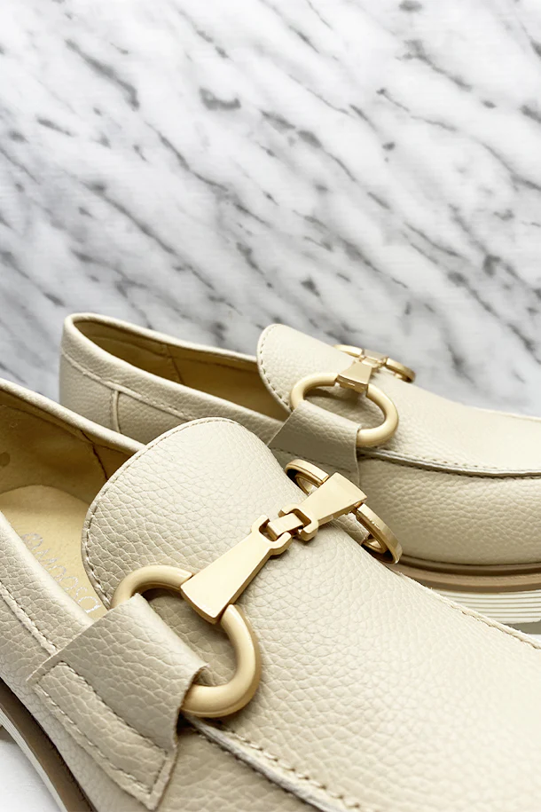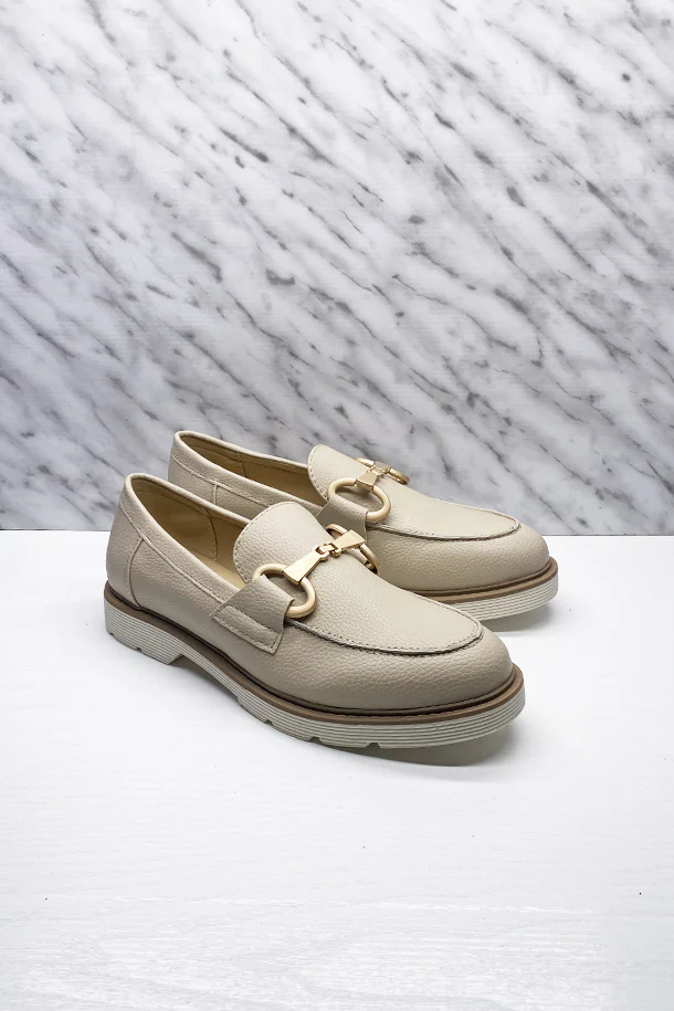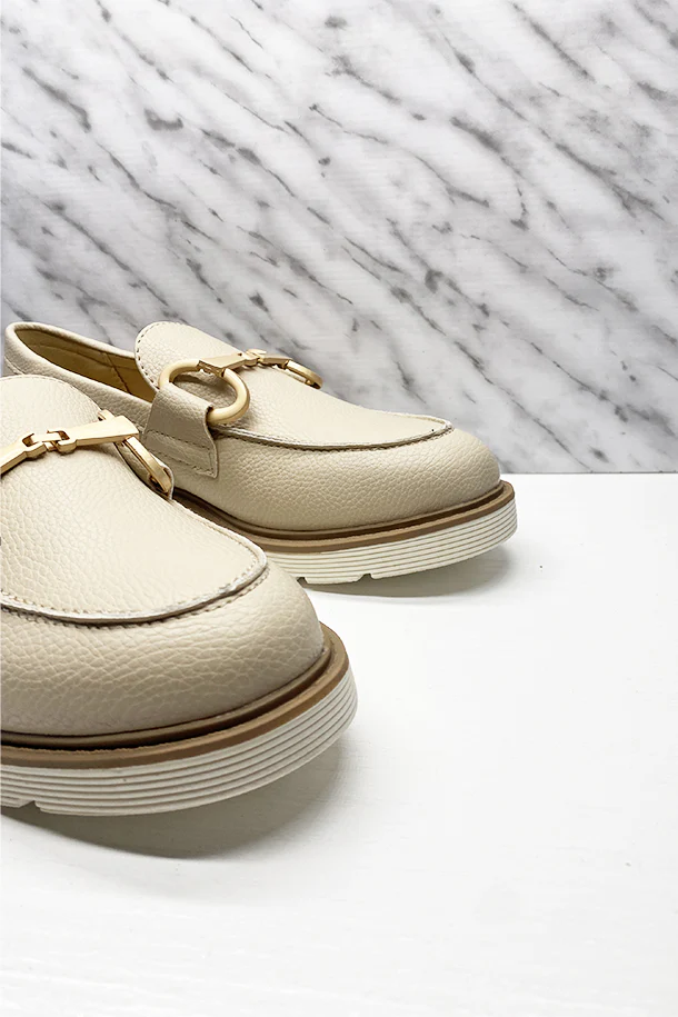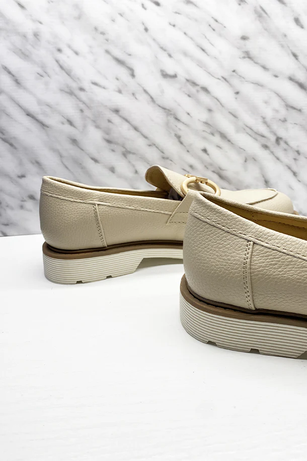 Mocassini slip on in eco pelle martellata con fibbia metallica decorativa frontale, suola scanalata in gomma con bordo a contrasto