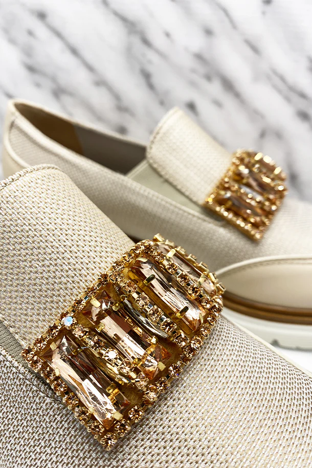 Mocassini slip on in nylon con inserti in eco pelle ton sur ton, inserti elastici, fibbia metallica con brillanti, suola in gomma a carrarmato