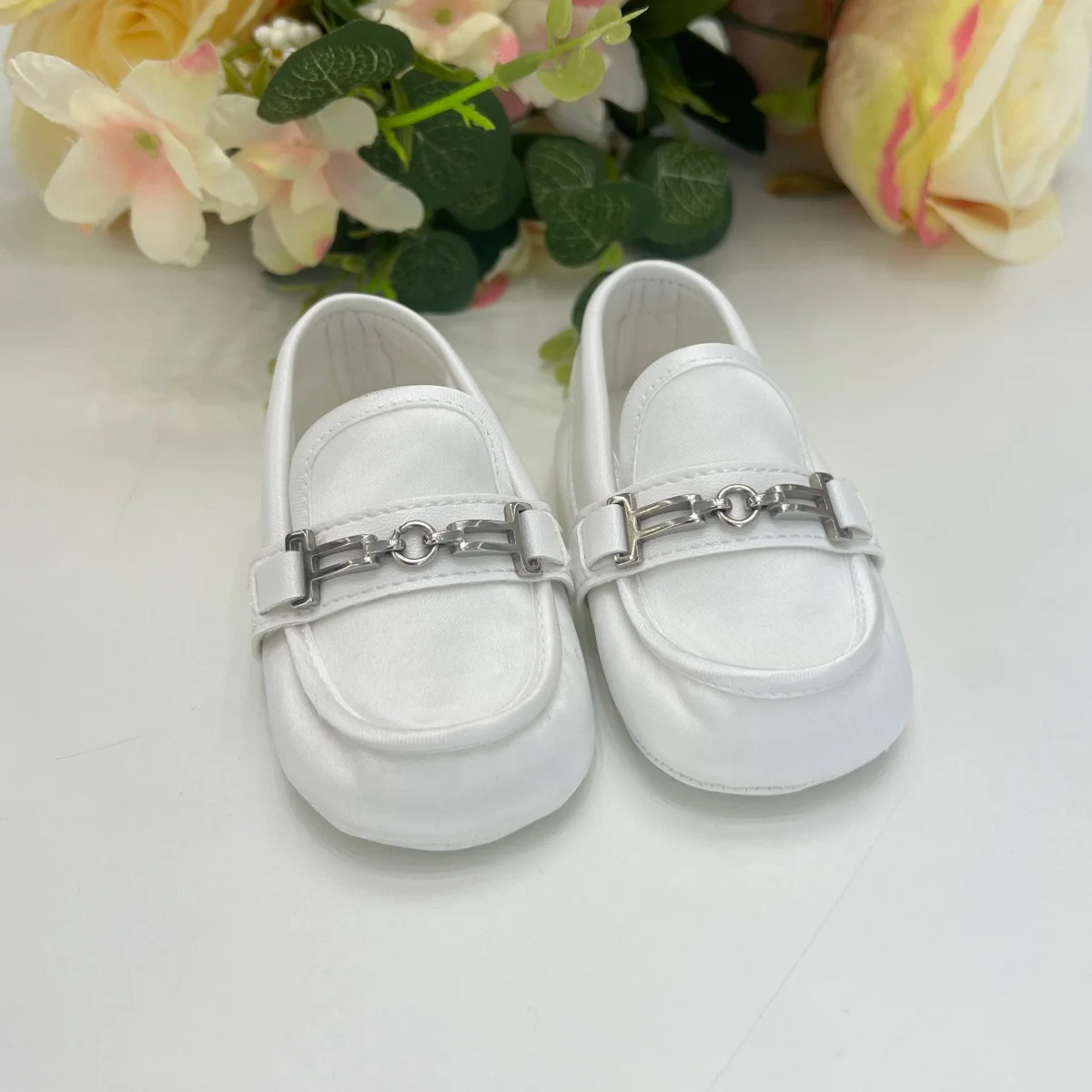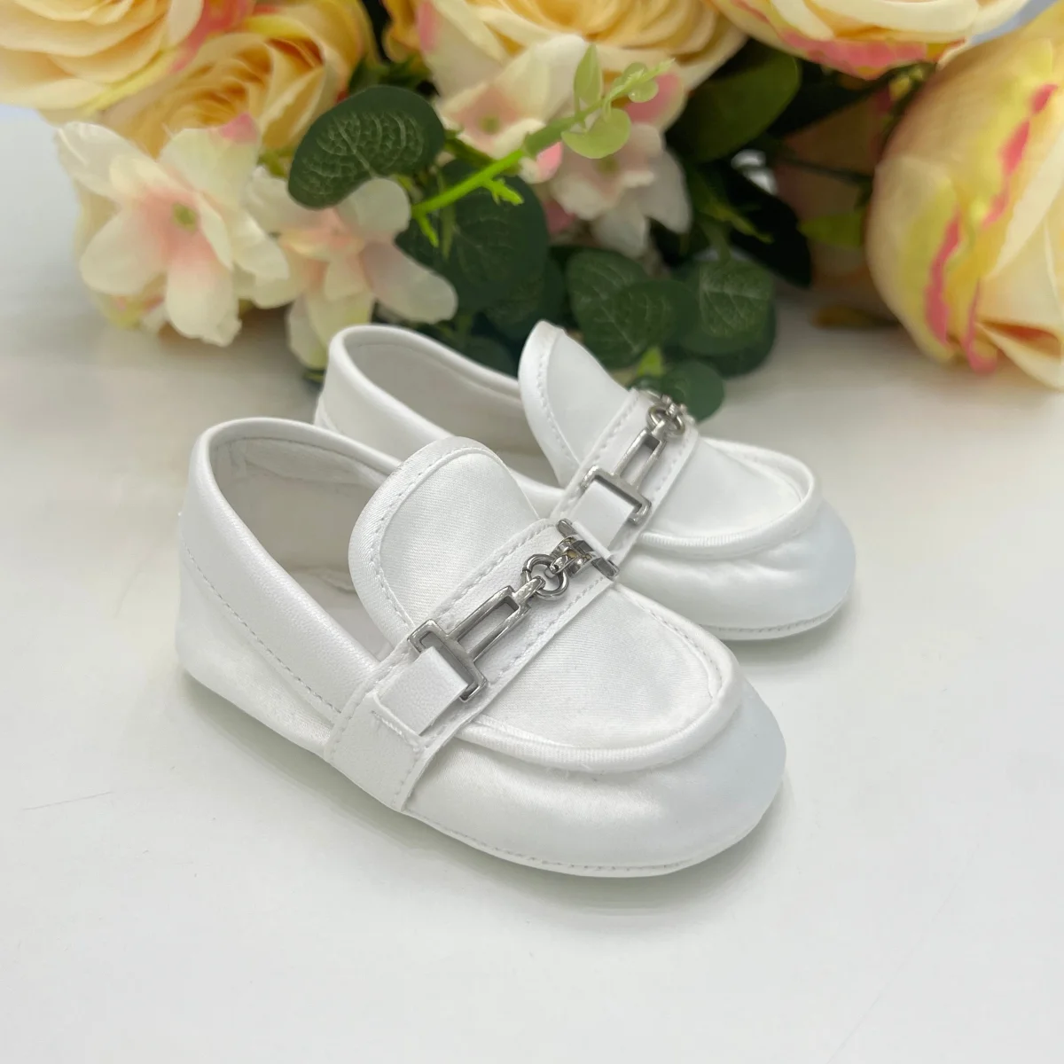 Mocassino da culla bianco dal design elegante e raffinato. Modello classico con morsetto decorativo sul davanti che richiama lo stile intramontabile del mocassino tradizionale.