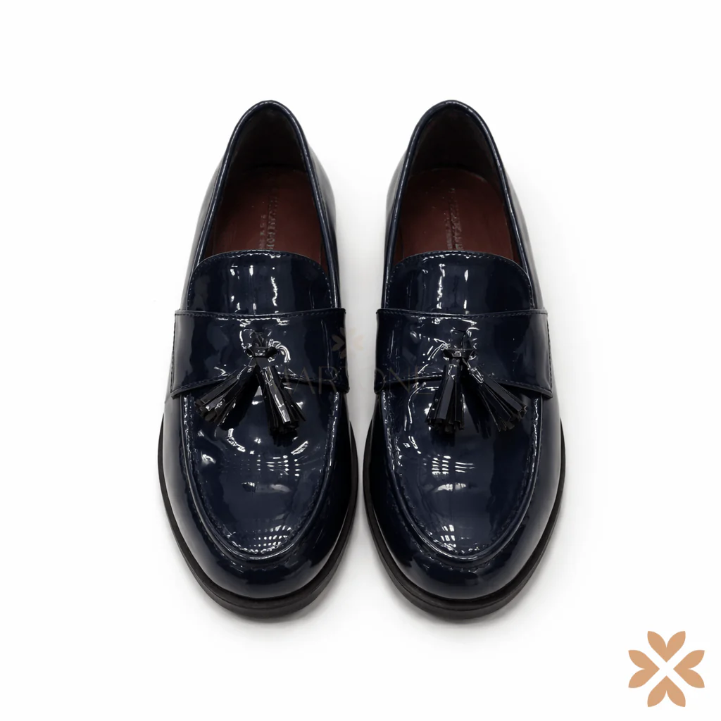 Mocassino elegante bimbo in vernice blu con nappine, dal design sofisticato e ideale per cerimonie e look formali.