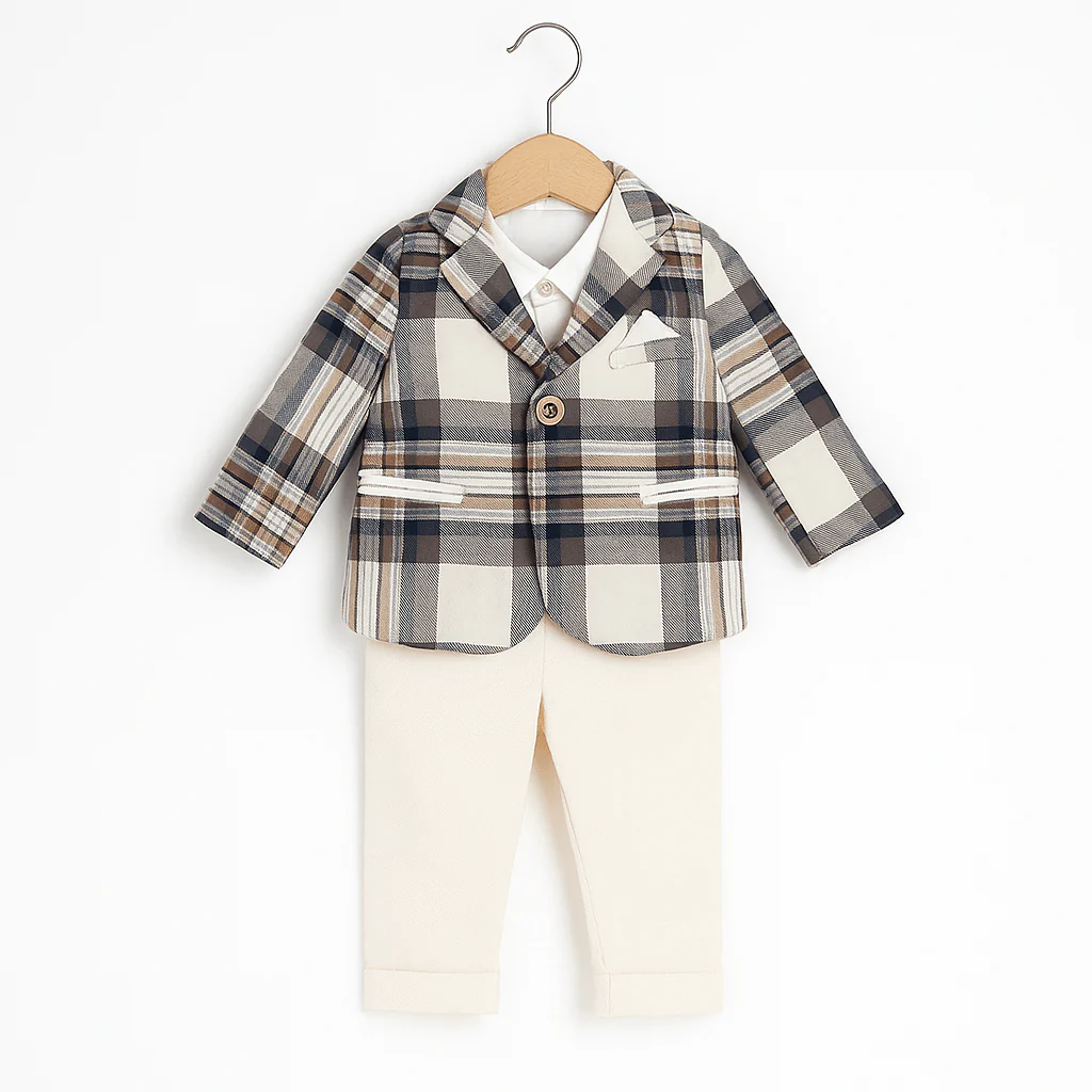 Completo elegante per neonato composto da camicia con colletto classico, giacca a quadri con taschini, rever strutturato e fazzoletto decorativo, abbinata a pantaloni color panna con risvolto al fondo. Un insieme raffinato, curato nei dettagli e perfetto per cerimonie e occasioni speciali.