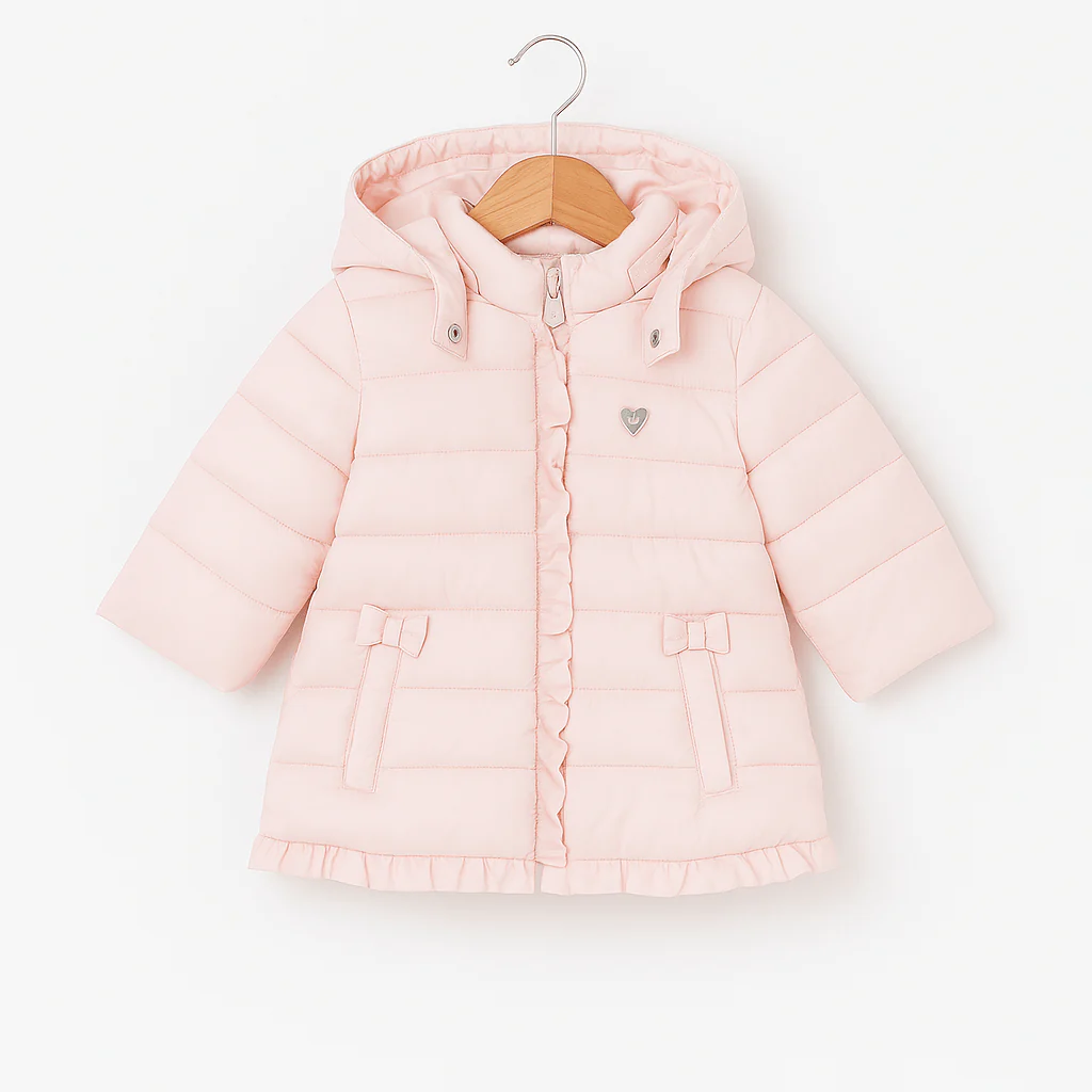 Piumino rosa chiaro dalla linea morbida, caratterizzato da un design dolce e curato nei dettagli. Il cappuccio avvolgente garantisce comfort, mentre la zip centrale è valorizzata da una romantica ruche che percorre tutta la lunghezza. Le taschine laterali sono decorate da piccoli fiocchi tono su tono, ripresi anche nel bordo arricciato sul fondo. Completato da un delicato cuore metallico applicato sul petto. Un modello caldo e raffinato, perfetto per le giornate più fredde.