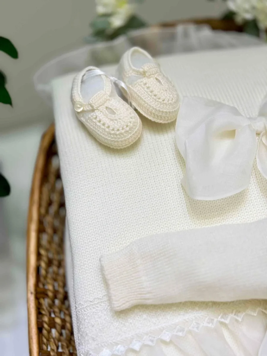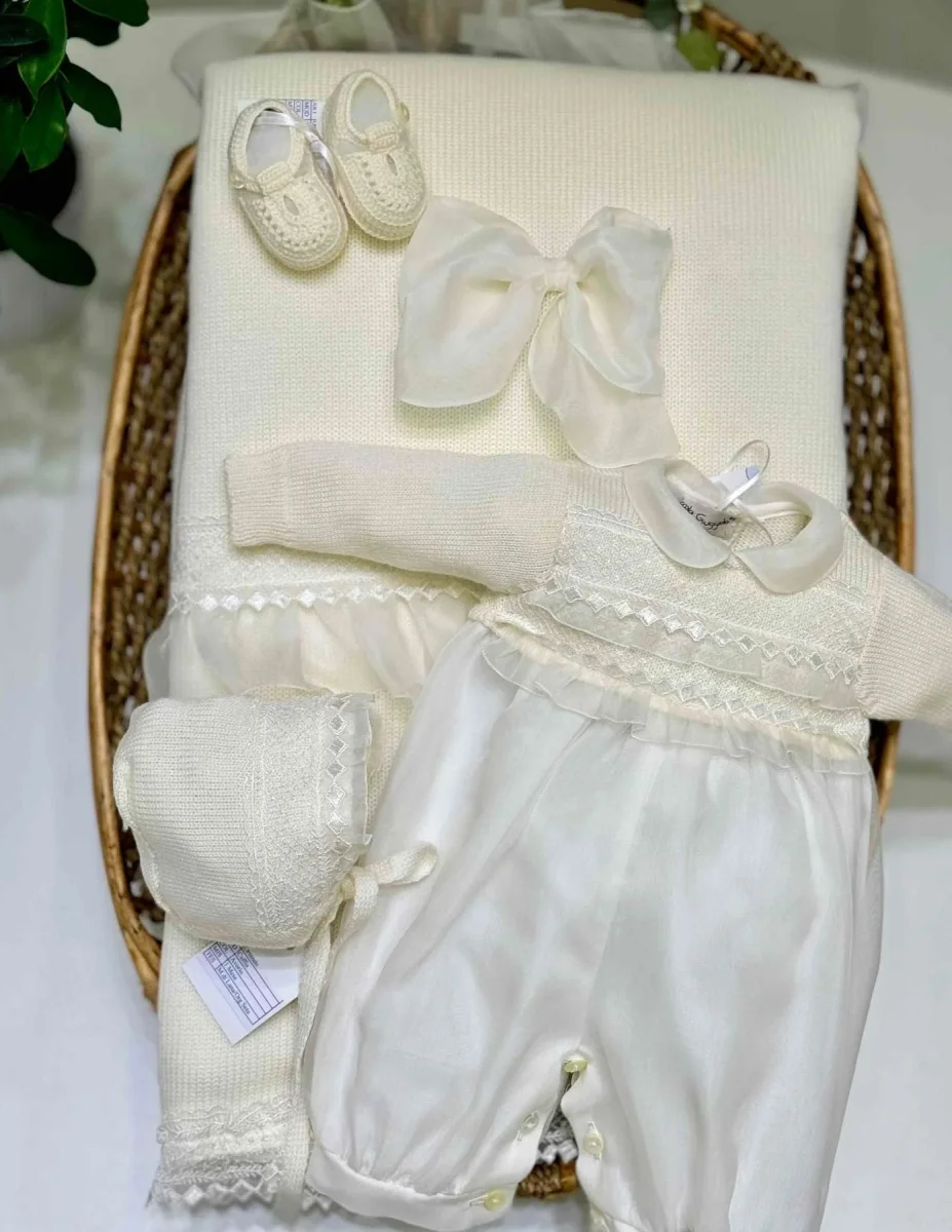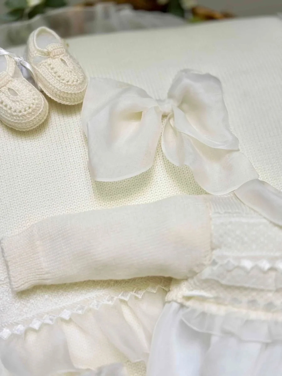 Coordinato coperta carrozzina 100% lana con fiocco centrale in organza bordato in merletto e balze di organza, tutina intera di organza in seta con corpetto di lana con balze di organza e pizzo e scarpine.