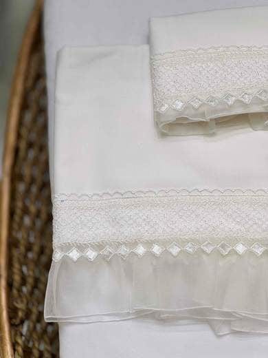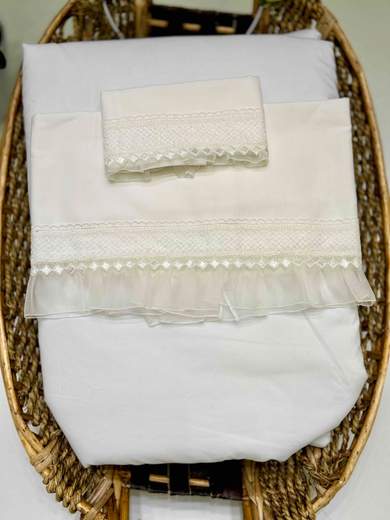 Lenzuolo carrozzina di cotone battista con rouches in organza bordato in pizzo